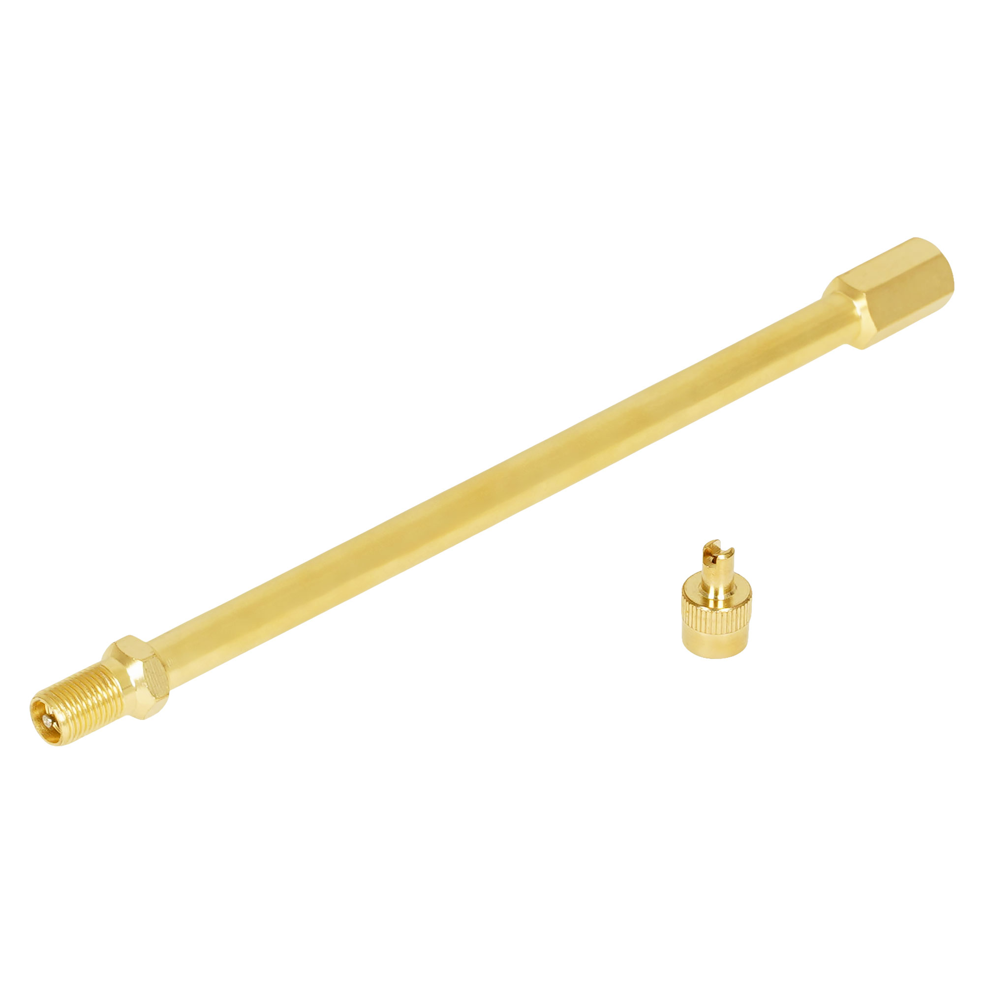 Удлинитель вентиля предназначен для подкачки внутренного колеса на спаренных (сдвоенных) колесах грузовиков, самосвалов, тягачей и другой техники, имеющей по 4 колеса на заднем мосту. Удлинитель накручивается на вентиль и остается на нем на постоянной основе. Через удлинитель можно без проблем подкачать внутренне колесо или проверить давление воздуха в нем.