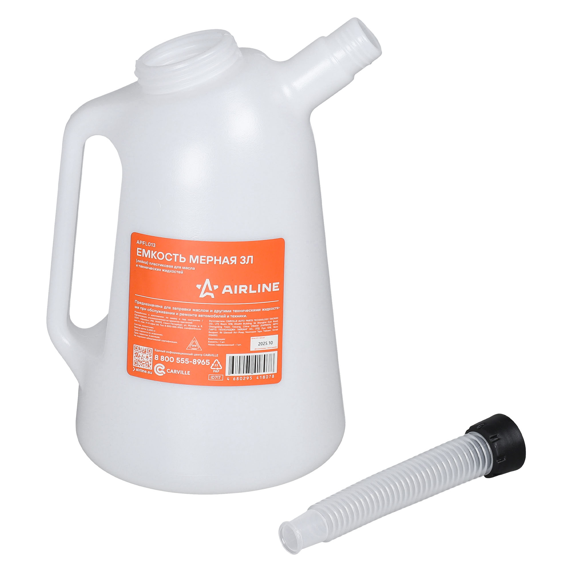 Емкость (лейка) мерная 3л пластиковая AIRLINE APFL013 предназначена для заправки маслом и другими техническими жидкостями при обслуживании и ремонте автомобилей и техники. Изделие имеет гофрированный гибкий носик для заправки.