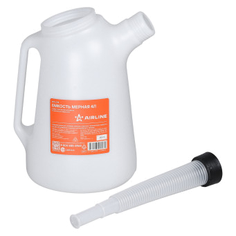 Емкость (лейка) мерная 4л пластиковая AIRLINE APFL014 предназначена для заправки маслом и другими техническими жидкостями при обслуживании и ремонте автомобилей и техники. Изделие имеет гофрированный гибкий носик для заправки.