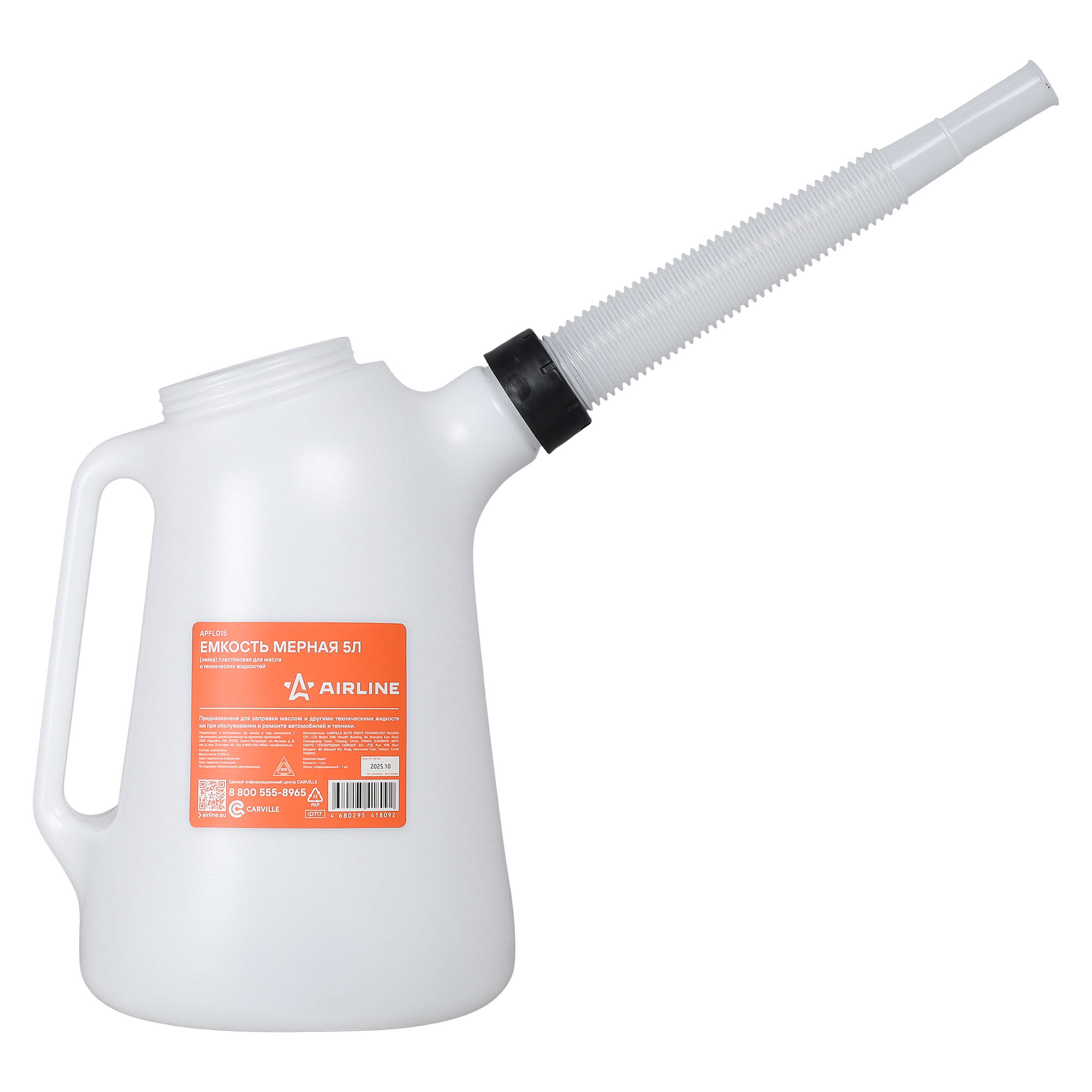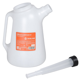 Емкость (лейка) мерная 5л пластиковая AIRLINE APFL015 предназначена для заправки маслом и другими техническими жидкостями при обслуживании и ремонте автомобилей и техники. Изделие имеет гофрированный гибкий носик для заправки.