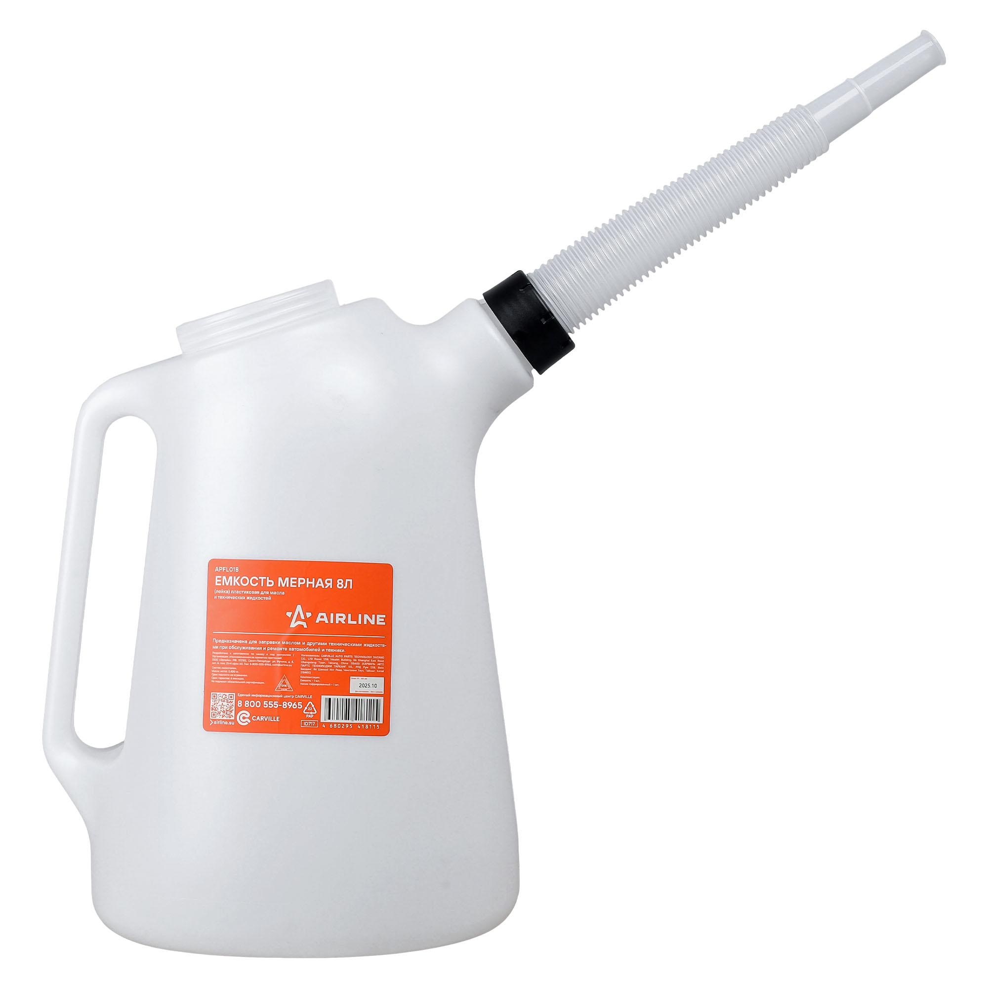 Емкость (лейка) мерная 6л пластиковая AIRLINE APFL018 предназначена для заправки маслом и другими техническими жидкостями при обслуживании и ремонте автомобилей и техники. Изделие имеет гофрированный гибкий носик для заправки.