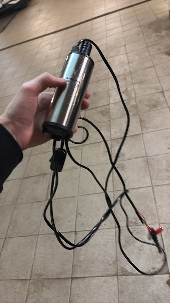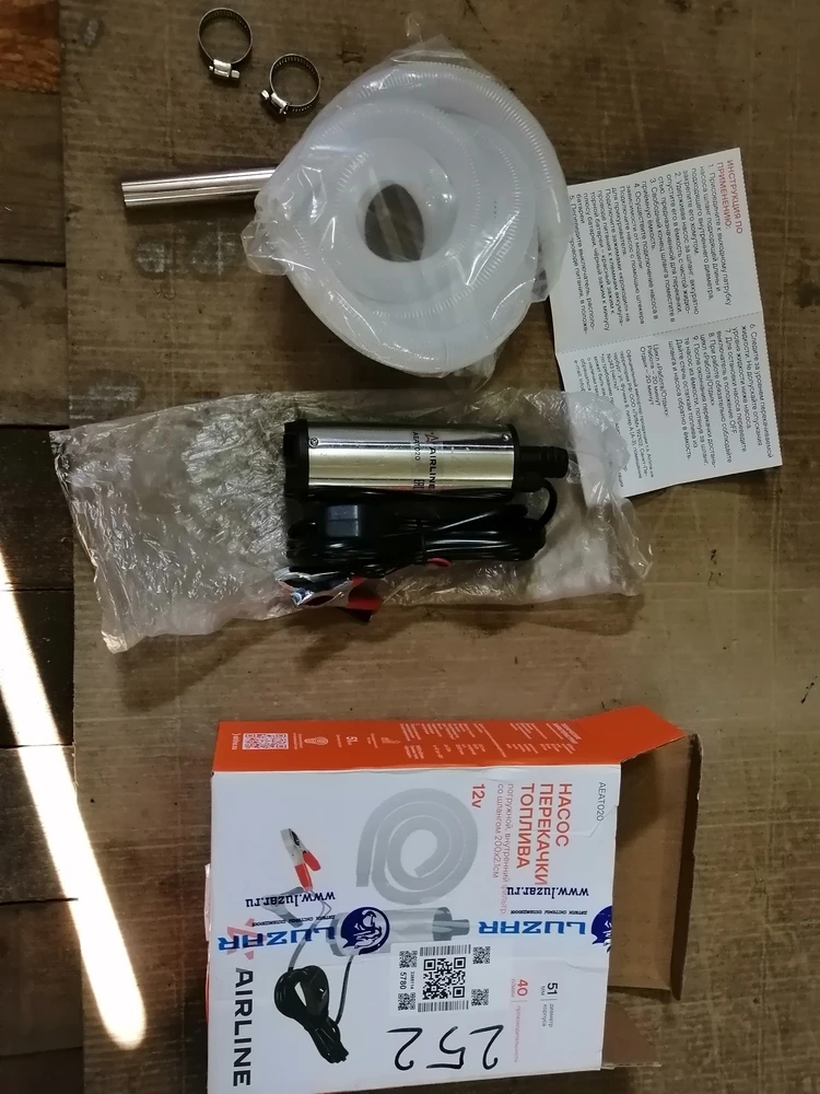 Отличительной особенностью этой модели является прочный гофрированный шланг длинной 2 метра, который идет в комплекте к насосу. Купив этот набор можно сэкономить время и деньги на покупке шланга в магазине. Погружной насос комплектуется выключателем, расположенным на проводе, зажимами типа «крокодил» и металлическим хомутом для обжима шланга. На дне насоса расположен фильтр грубой очистки из нержавеющей стали, благодаря нему в топливный бак автомобиля точно не попадут частицы мусора.