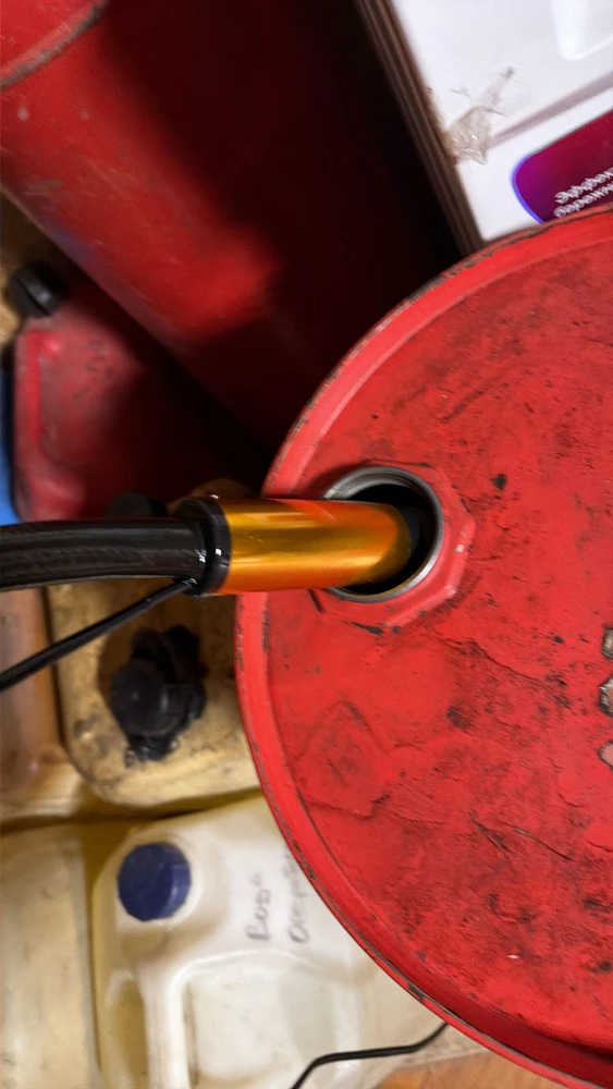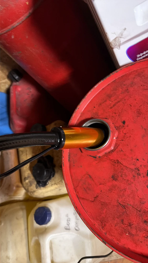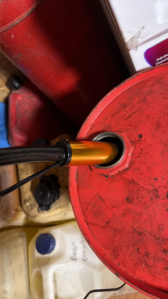 Чтобы начать работу, достаточно присоединить топливный шланг и аккумулятор. Насос устойчиво стоит на дне емкости и не присасывается ко дну.