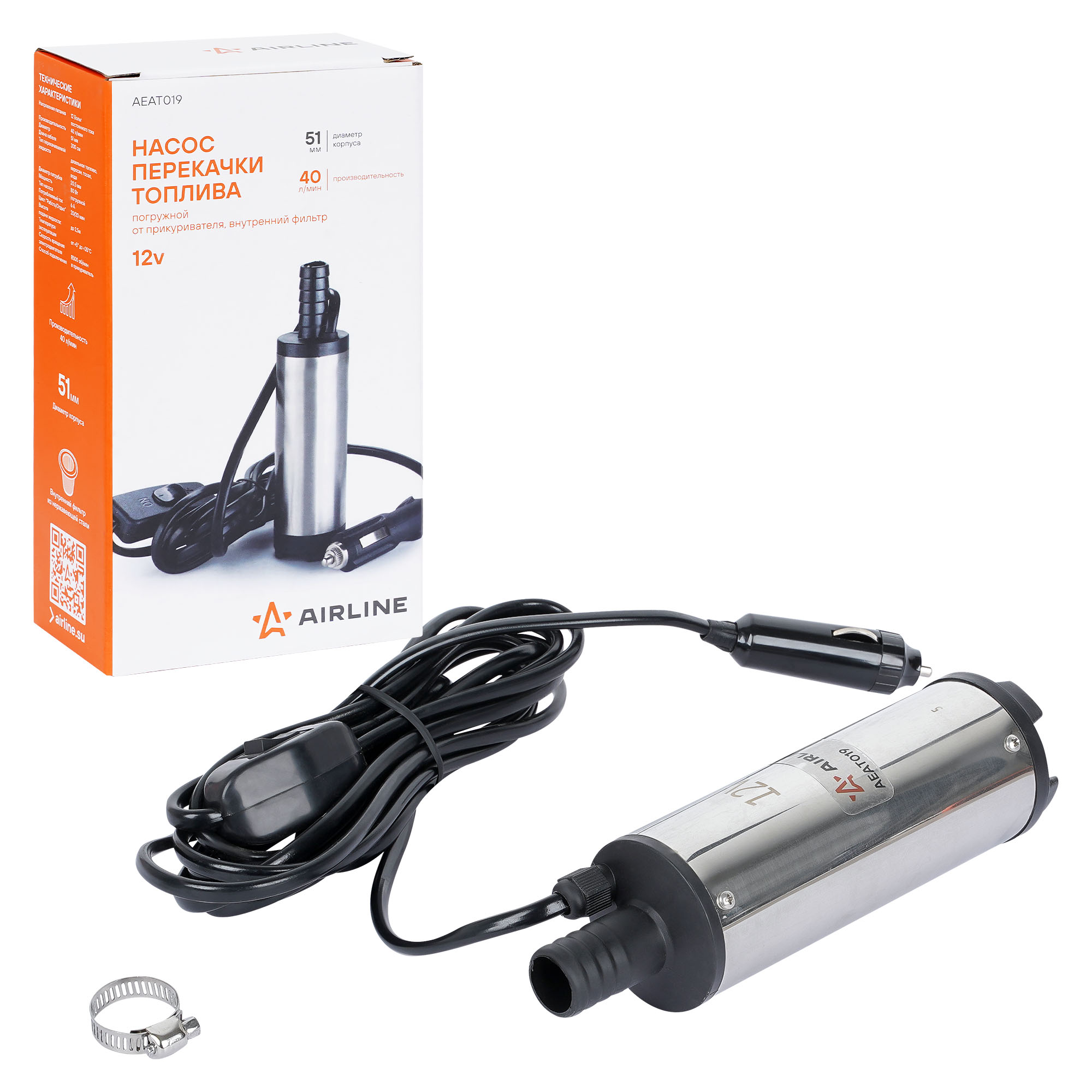 Насос погружной AIRLINE AEAT019 12В диаметром 51мм предназначен для перекачки дизельного топлива из бочки, цистерны или любой другой емкости с достаточно узким горлышком.