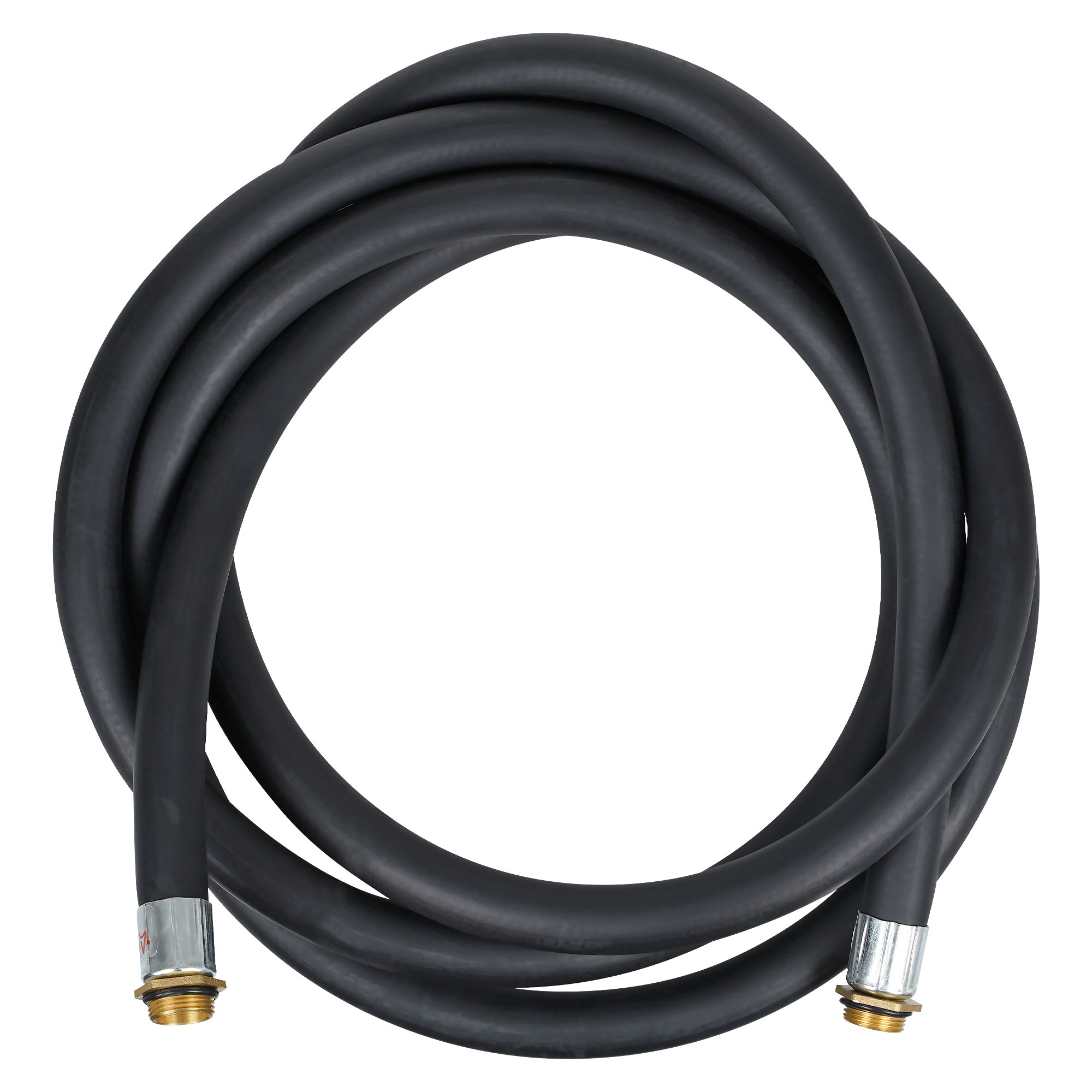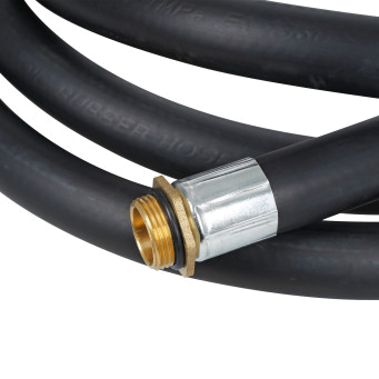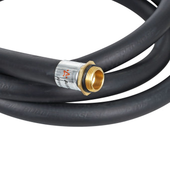 Резиновый шланг для насосов перекачки топлива и пистолетов со встроенными фитингами разного диаметра резьбы. Маслобензостойкий материал — бутадиен-нитрильный каучук.