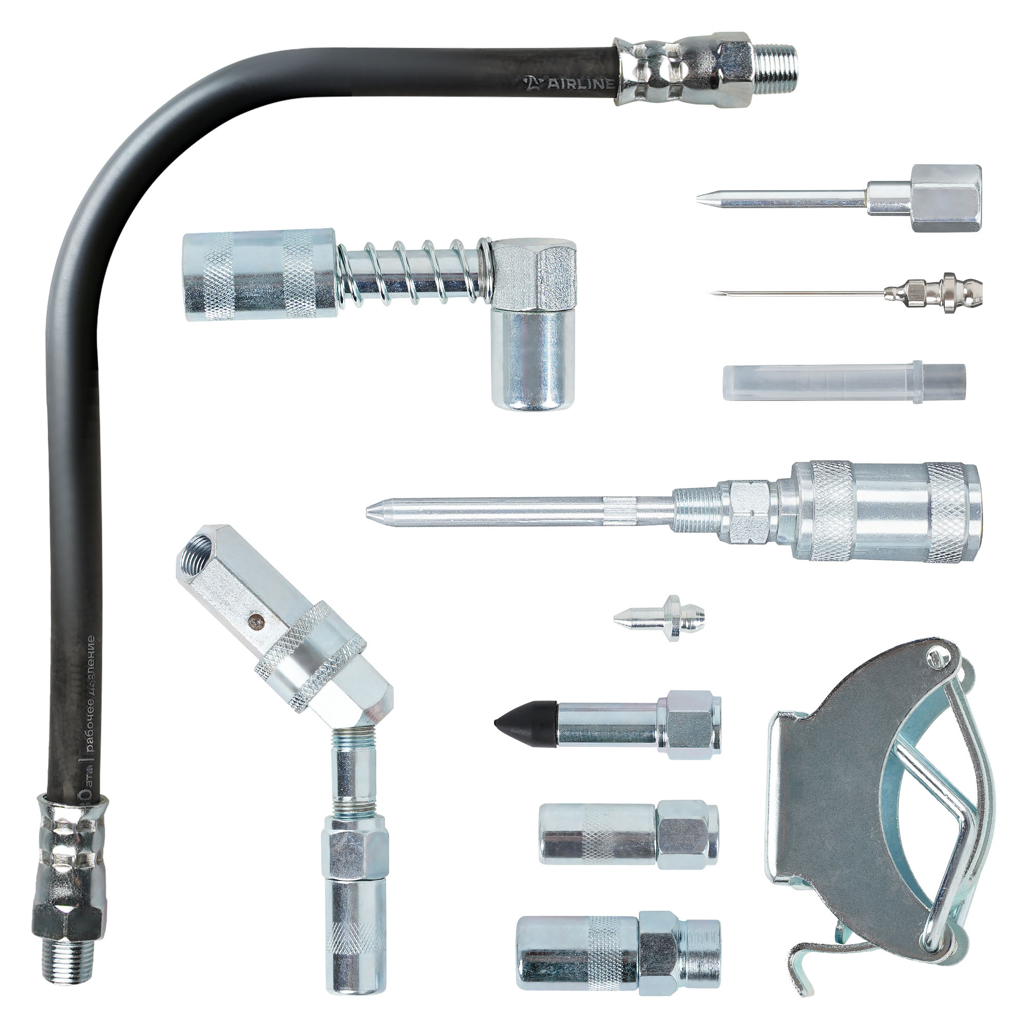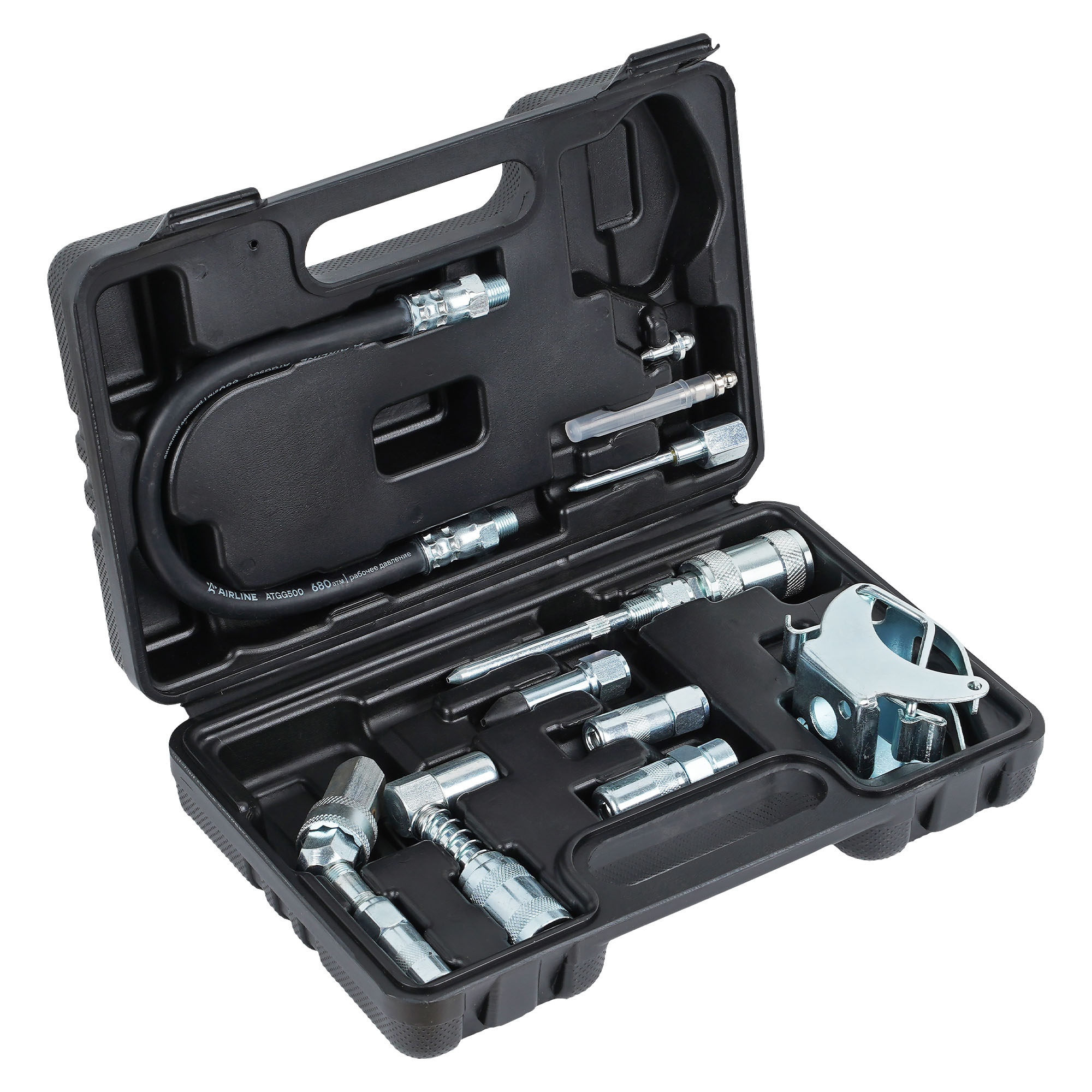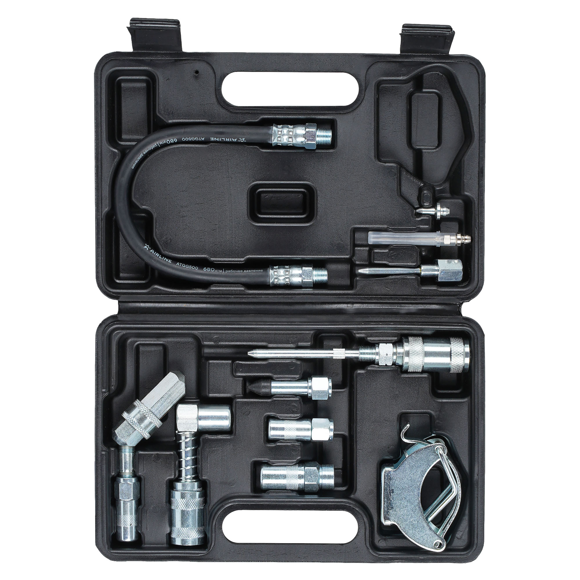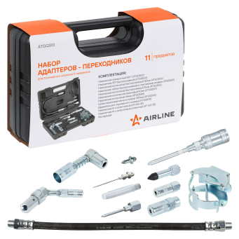 Набор ATGG0510 поставляется в пластиковом кейсе. Включает в себя различные виды быстросъемных и навинчивающихся адаптеров-переходников для осуществления смазочных работ в самых труднодоступных местах. Комплектация: