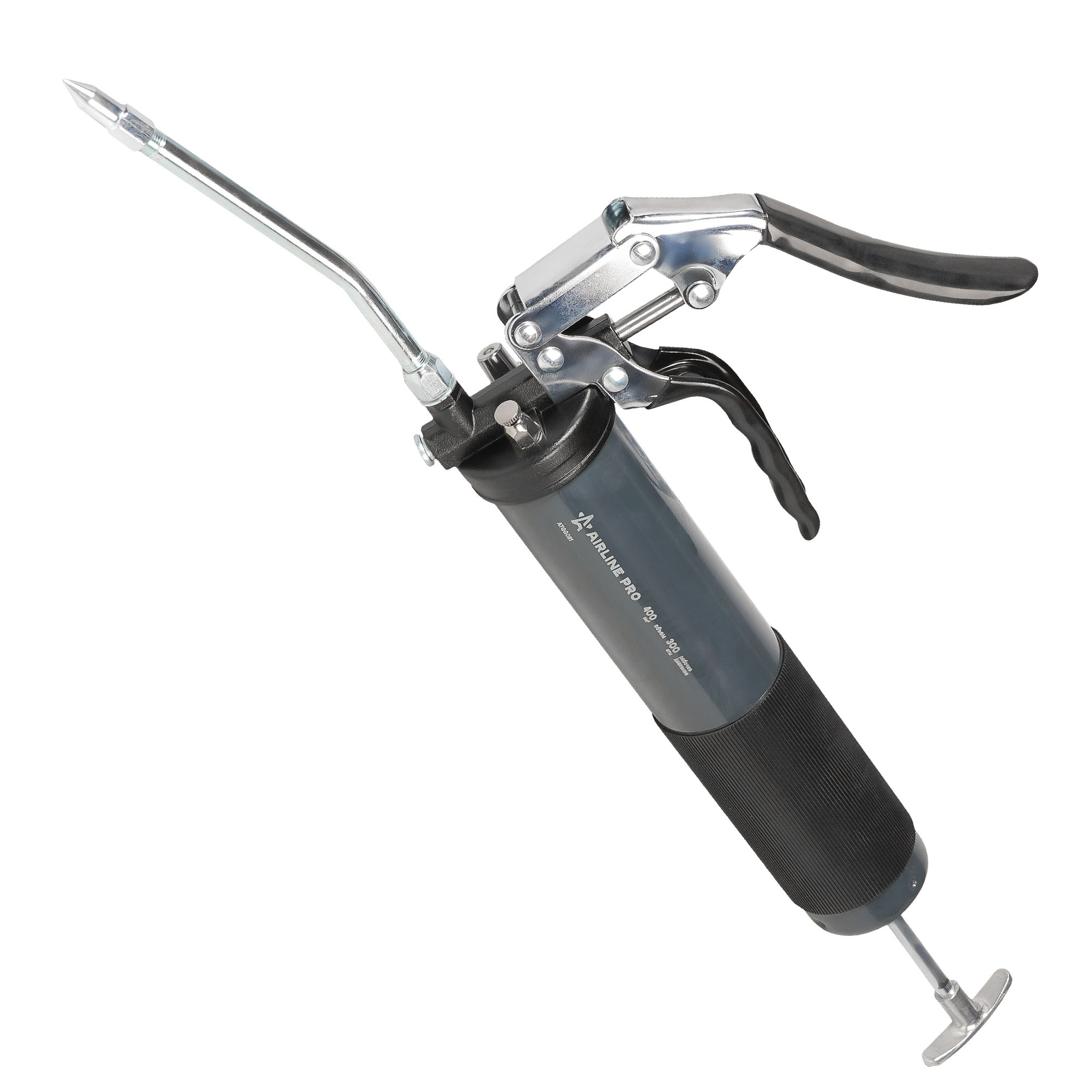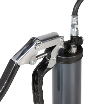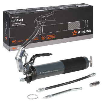 Шприц рычажно-плунжерный пистолетного типа AIRLINE ATGG082 предназначен для нагнетания пластичной (консистентной) смазки в различные узлы и агрегаты, подверженные трению. Производится из высокопрочной стали на автоматизированном оборудовании. Применяется для обслуживания легковых автомобилей, грузовых, тракторов, спецтехники, промышленного оборудования и станков. Изделие имеет возможность заправки тремя способами: с помощью картриджа (туба со смазкой 400гр), ручным способом (шпателем/из емкости) и нагнетателем смазки через специальный клапан. На головке шприца имеется специальный высокоэффективный клапан винтового типа для удаления воздуха. Шприц комплектуется резиновым износостойким шлангом 300мм, усиленной стальной трубкой 150мм, а также четырехлепестковым и коническим наконечником. Данная модель оснащена нескользящей резиновой накладкой, которая способствует улучшенному сцеплению с цилиндрическим корпусом шприца при эксплуатации.