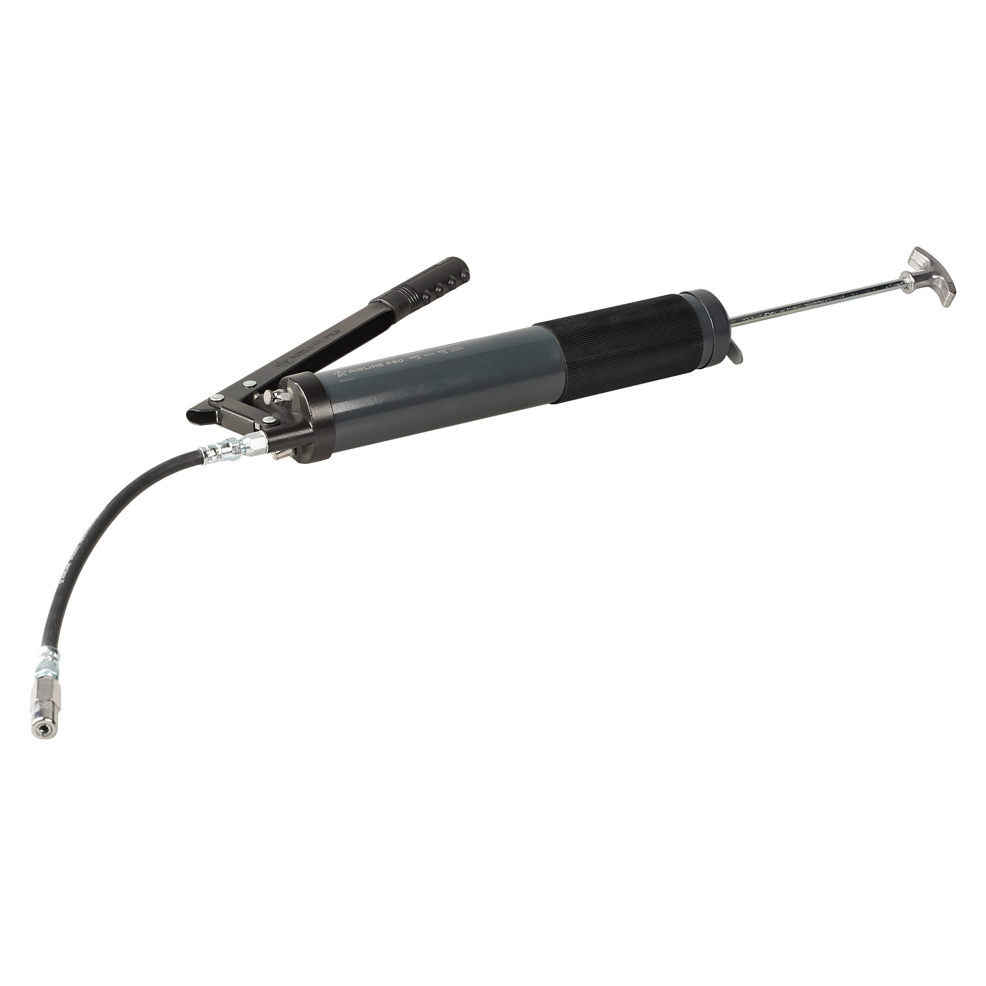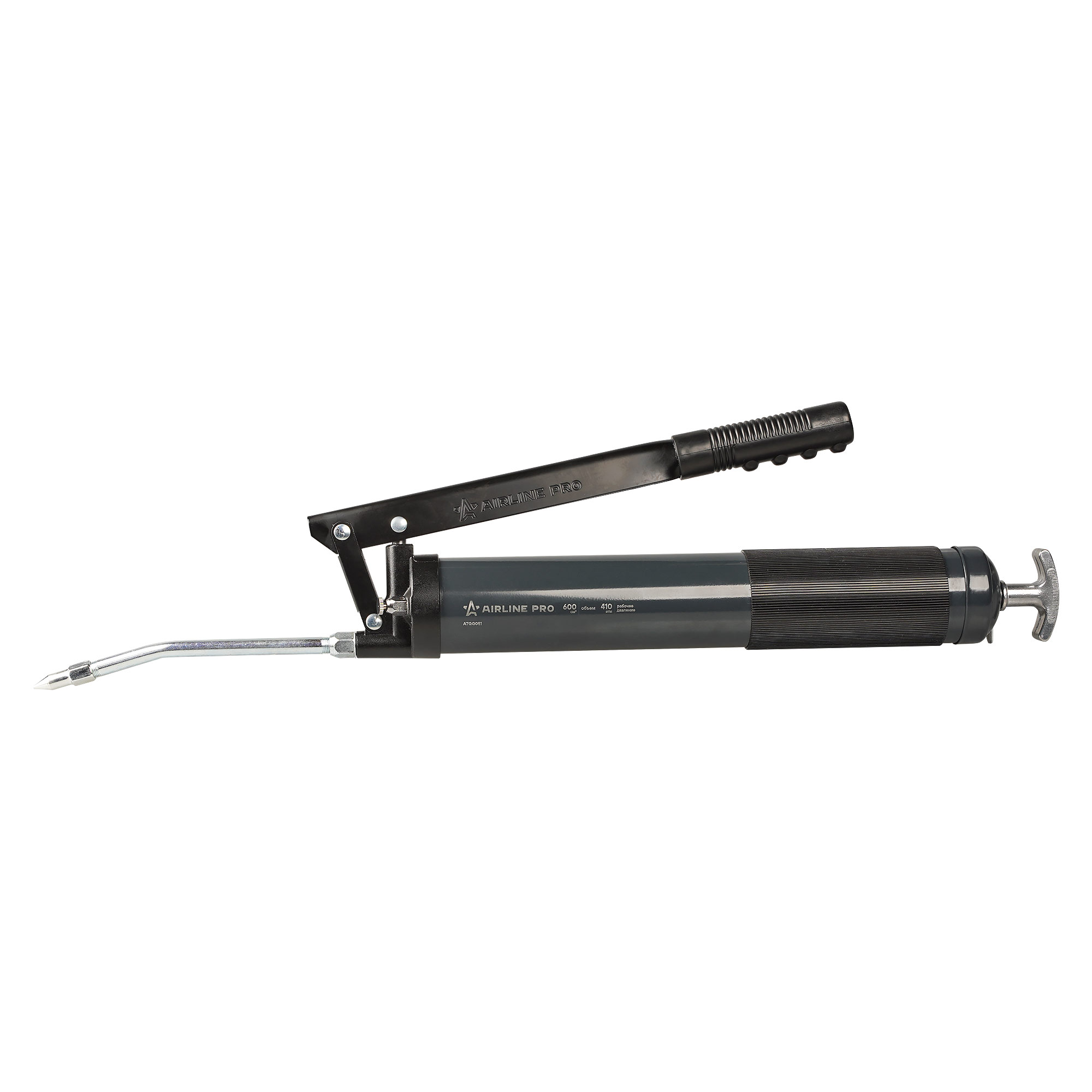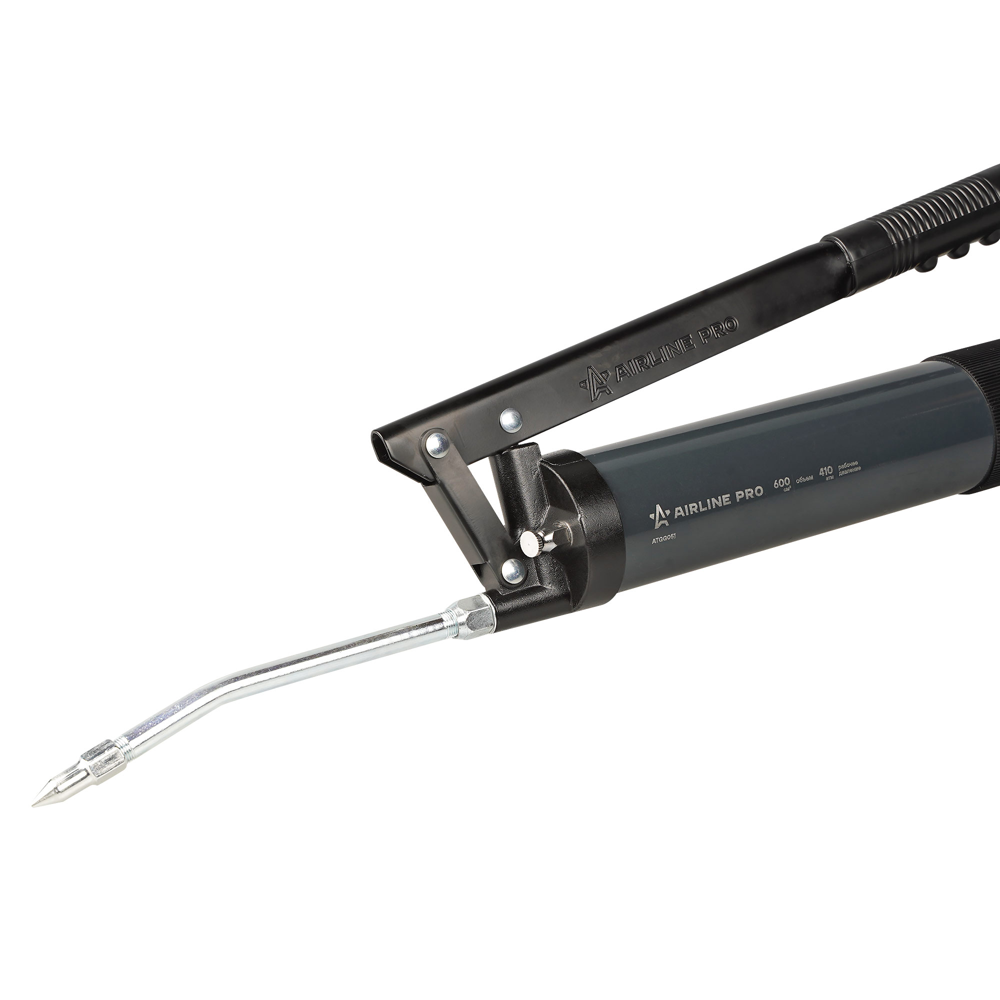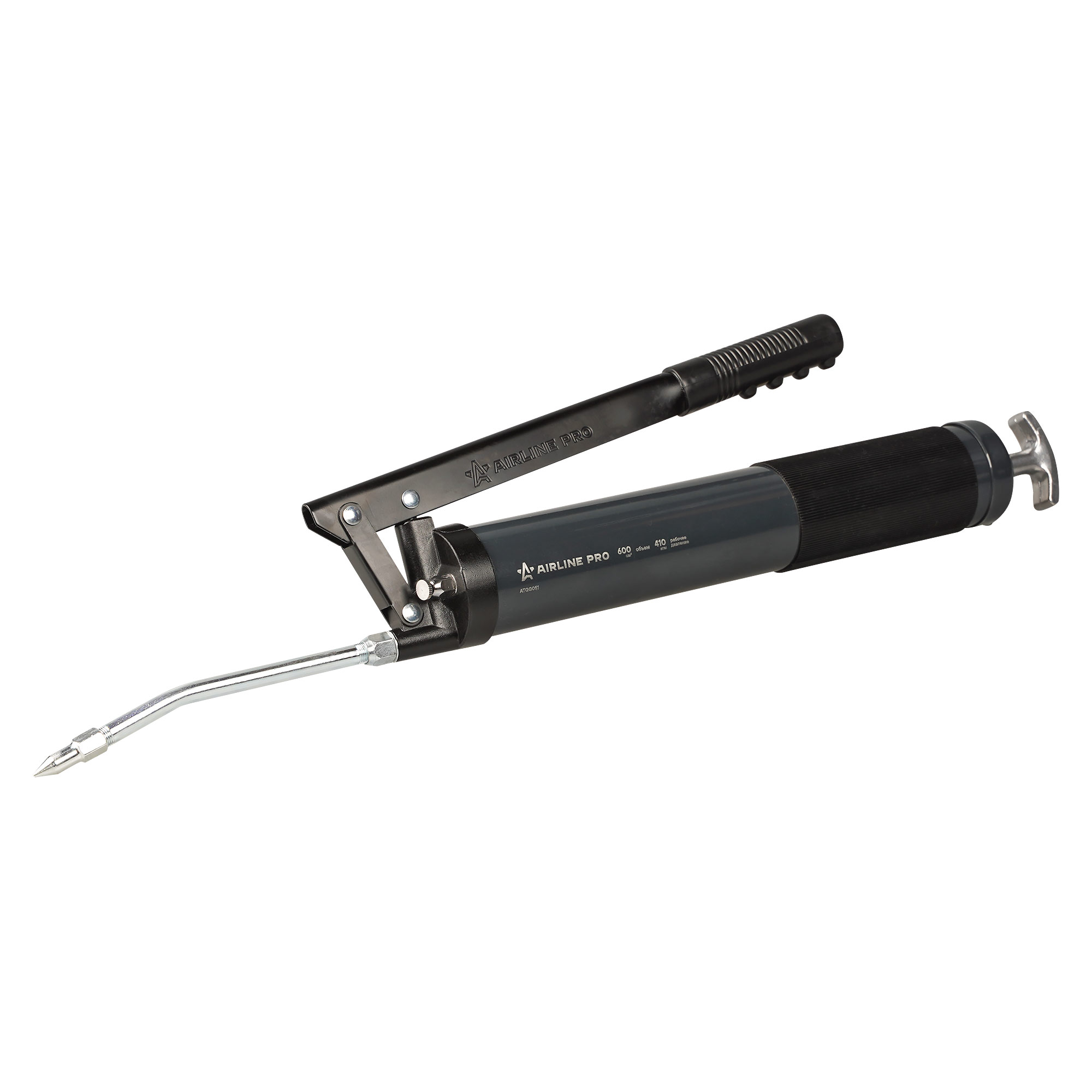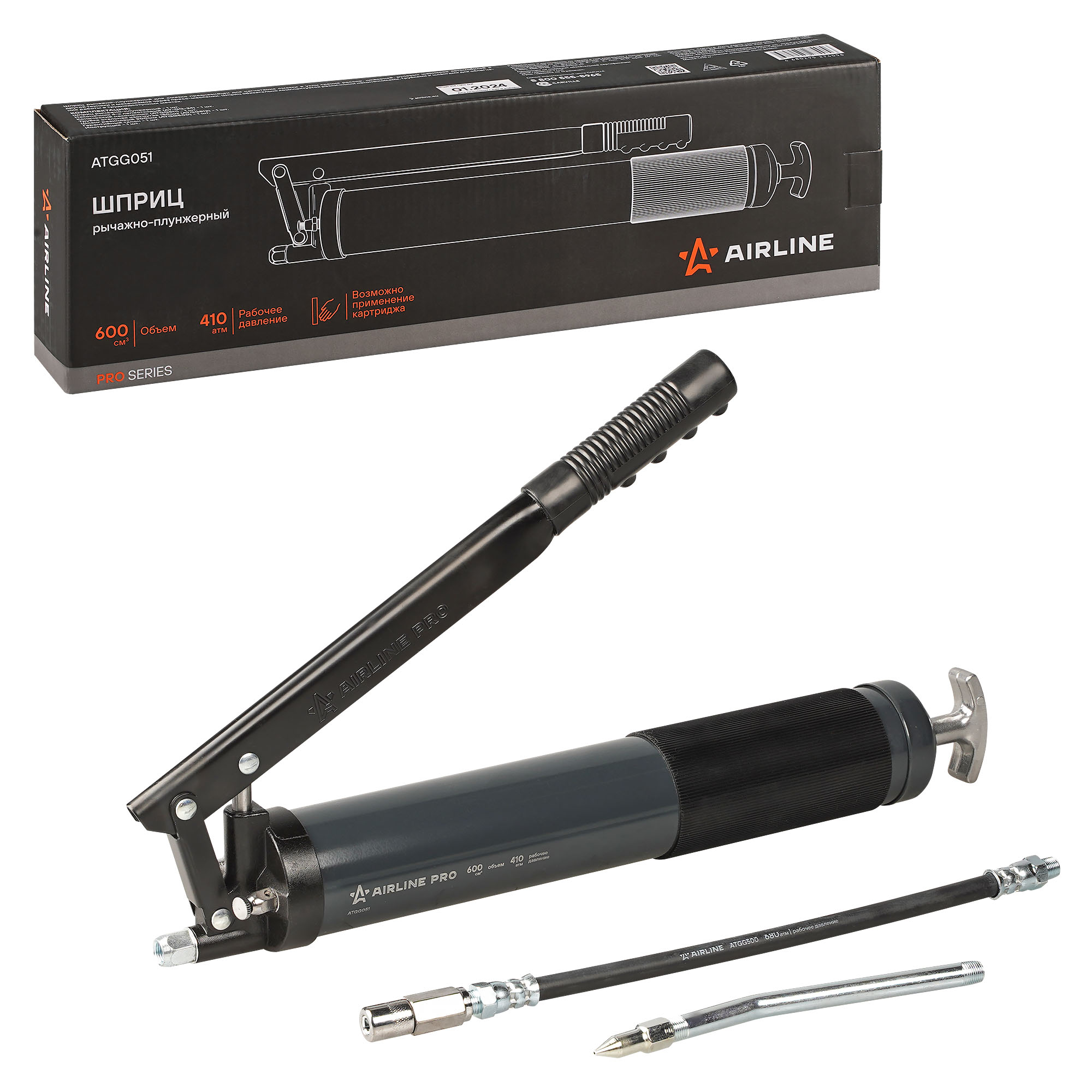 Шприц рычажно-плунжерный AIRLINE ATGG051 предназначен для нагнетания пластичной (консистентной) смазки в различные узлы и агрегаты, подверженные трению. Производится из высокопрочной стали на автоматизированном оборудовании. Применяется для обслуживания легковых автомобилей, грузовых, тракторов, спецтехники, промышленного оборудования и станков. Изделие имеет возможность заправки тремя способами: с помощью картриджа (туба со смазкой 400гр), ручным способом (шпателем/из емкости) и нагнетателем смазки через специальный клапан. На головке шприца имеется специальный высокоэффективный клапан винтового типа для удаления воздуха. Шприц комплектуется резиновым износостойким шлангом 300мм, усиленной стальной трубкой 150мм, а также четырехлепестковым и коническим наконечником. Данная модель оснащена резиновой рукоятью для повышения удобства эксплуатации и нескользящей резиновой накладкой, которая способствует улучшенному сцеплению с цилиндрическим корпусом шприца при работе.