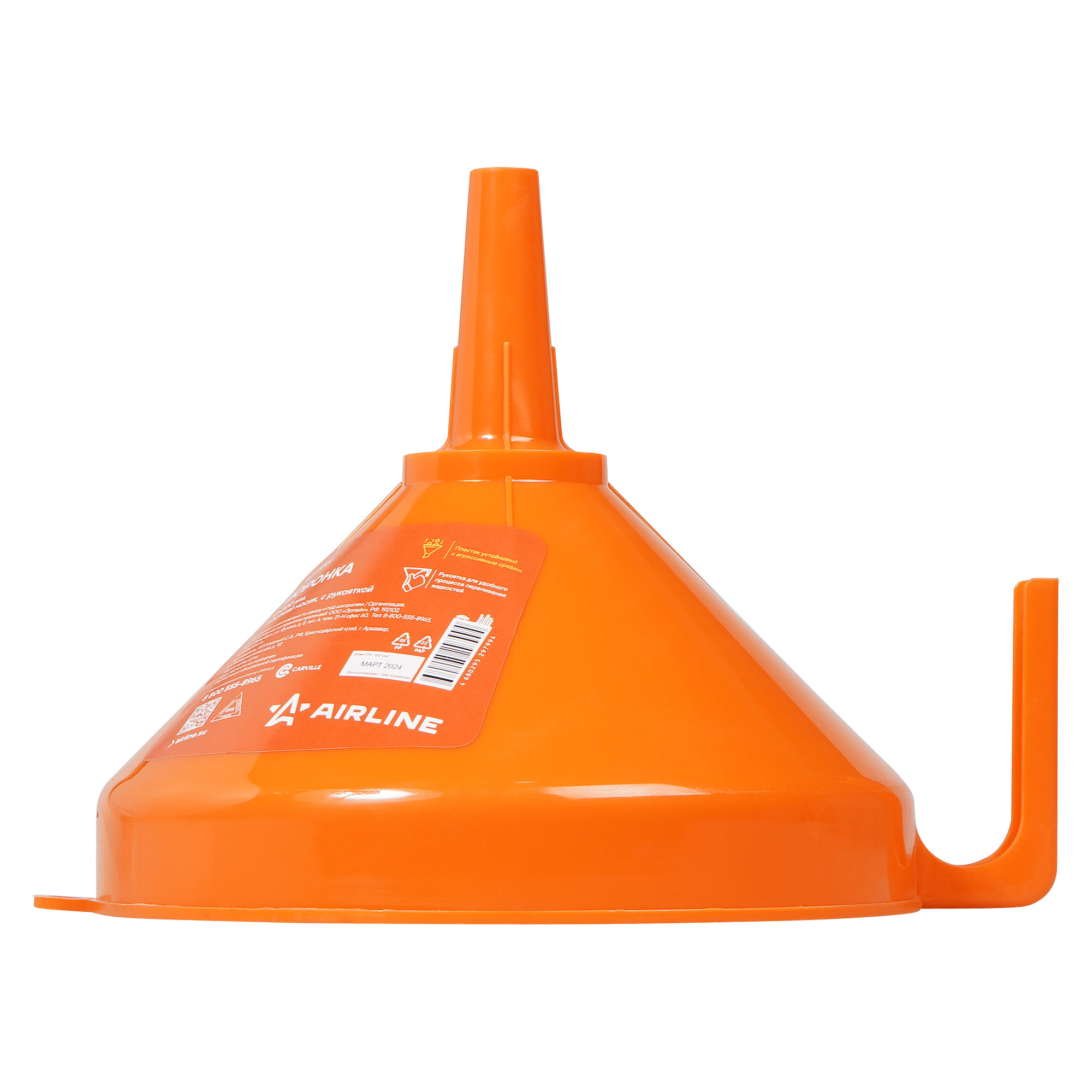 При наливании жидкости в воронку создается завихрение, что способствует ускоренному протеканию жидкости. Изделие оснащено рукояткой для более удобного процесса переливания жидкостей, а также отверстием для подвешивания.