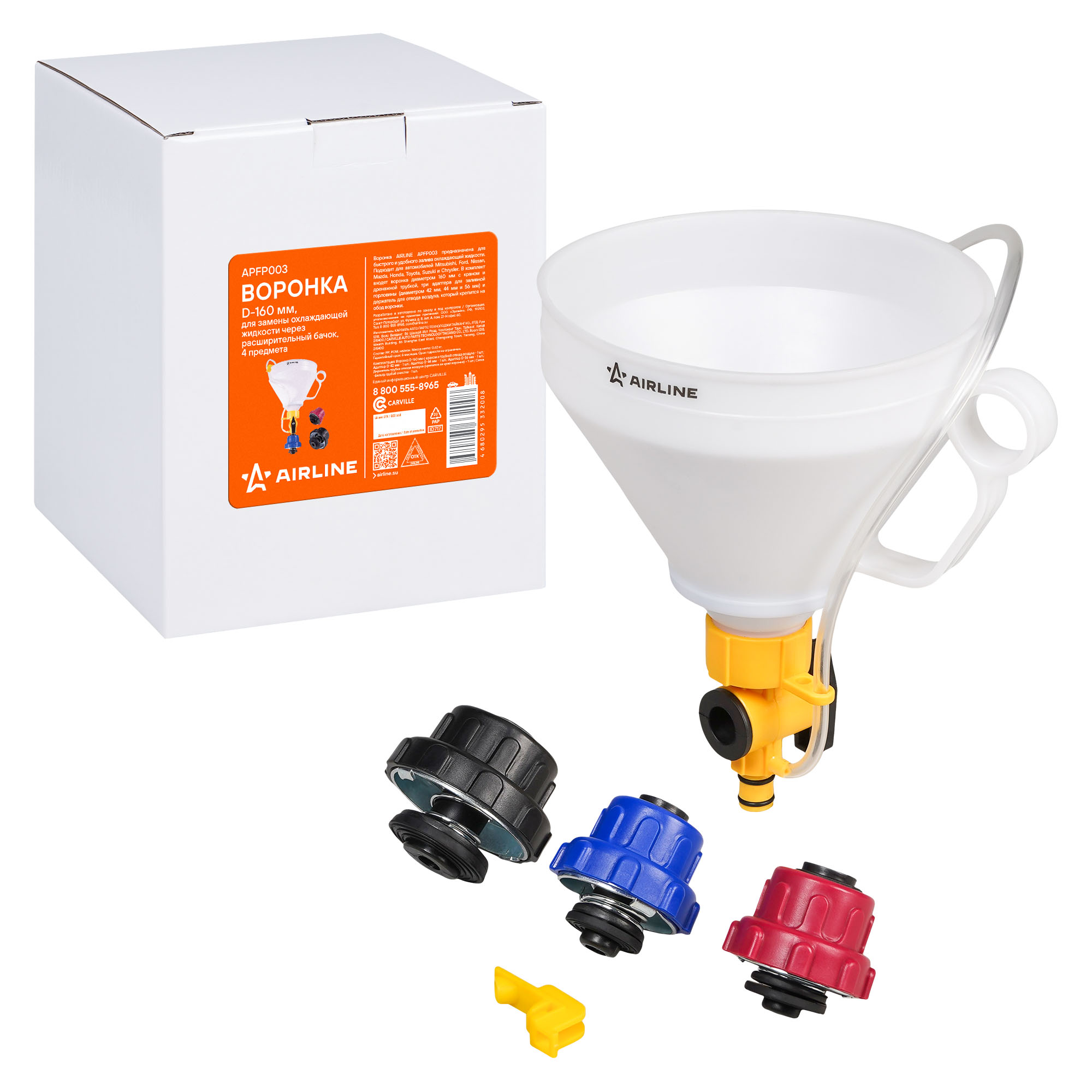 Воронка AIRLINE APFP003 предназначена для быстрого и удобного залива охлаждающей жидкости. Подходит для автомобилей Mitsubishi, Ford, Nissan, Mazda, Honda, Toyota, Suzuki и Chrysler. В комплект входят воронка диаметром 160 мм с краном и дренажной трубкой, три адаптера для заливной горловины (диаметром 42 мм, 44 мм и 56 мм) и держатель для отвода воздуха, который крепится на обод воронки. Воронка изготовлена из пластика PE-HD (полиэтилен высокой плотности/низкого давления), остальные элементы из PE-HD и стали. Кроме того, воронка также применяется для развоздушивания системы охлаждения автомобиля.