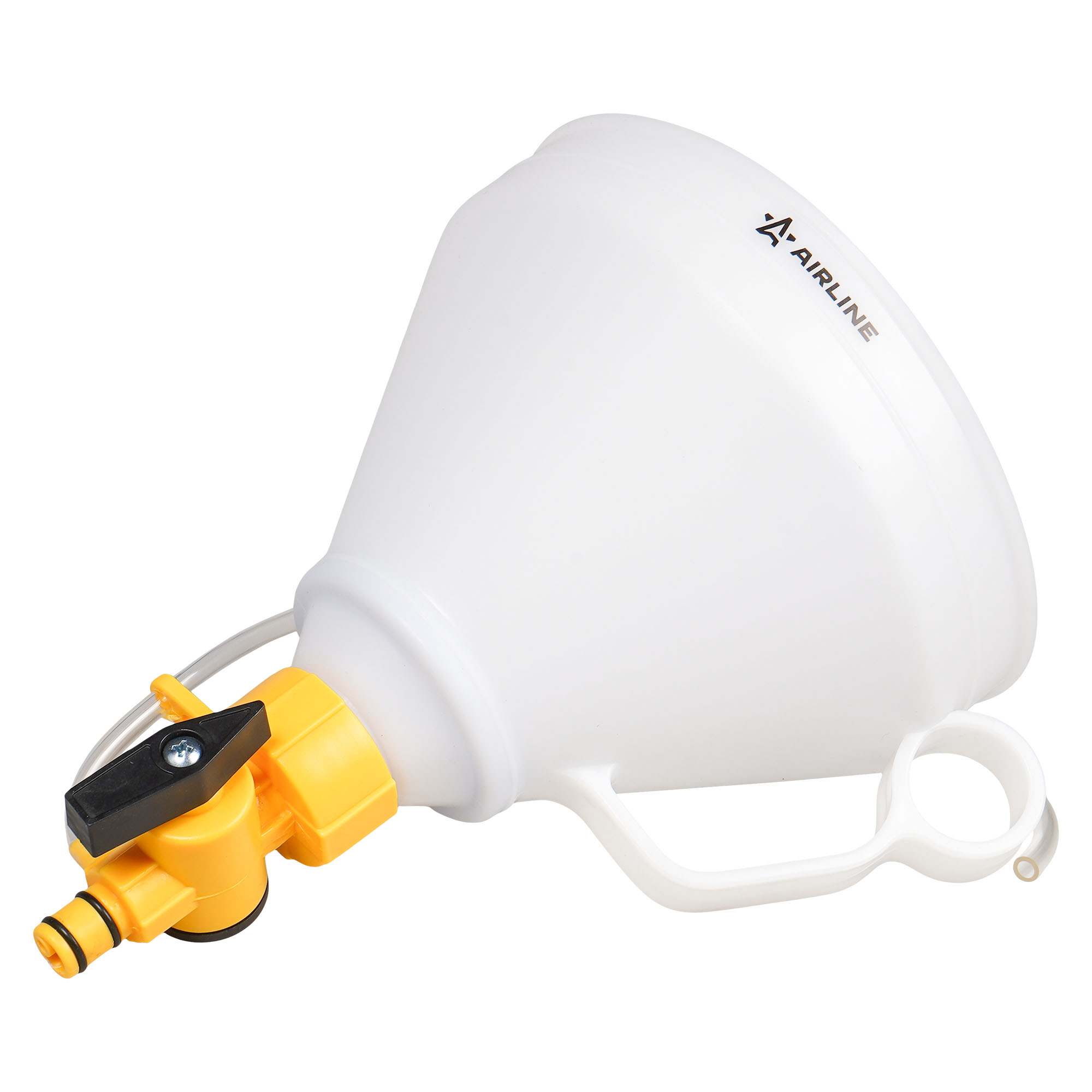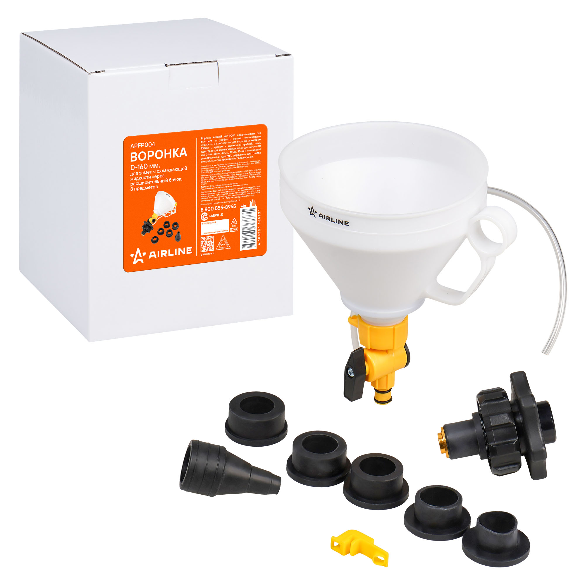 Воронка AIRLINE APFP004 предназначена для быстрого и удобного залива охлаждающей жидкости. В комплект входят воронка диаметром 160мм с краном и дренажной трубкой, семь адаптеров для заливной горловины (диаметром 28мм, 31мм, 35мм, 40мм, 42мм, 45мм и конический универсальный адаптер), держатель для отвода воздуха, который крепится на обод воронки. Воронка изготовлена из пластика PE-HD (полиэтилен высокой плотности/низкого давления), остальные элементы из PE-HD и стали. Кроме того, воронка также применяется для развоздушивания системы охлаждения автомобиля.