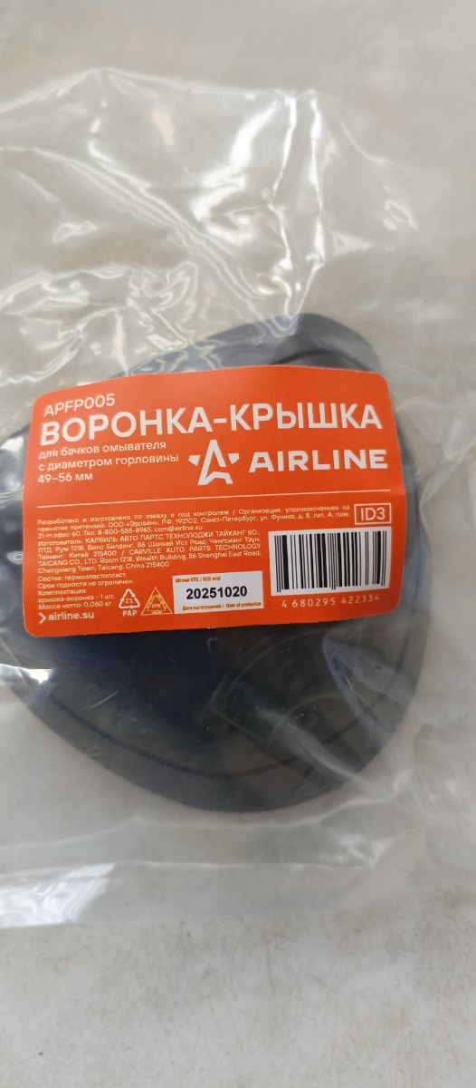 Крышка-воронка бачка омывателя AIRLINE APFP005 — это функциональный элемент, совмещающий крышку заливной горловины и воронку для удобного залива омывающей жидкости. Устанавливается на автомобили с диаметром заливной горловины бачка омывателя 49-56мм и обеспечивает герметичное закрытие, предотвращая испарение и загрязнение жидкости. При открытии крышка трансформируется в воронку, упрощая залив жидкости без проливов.
