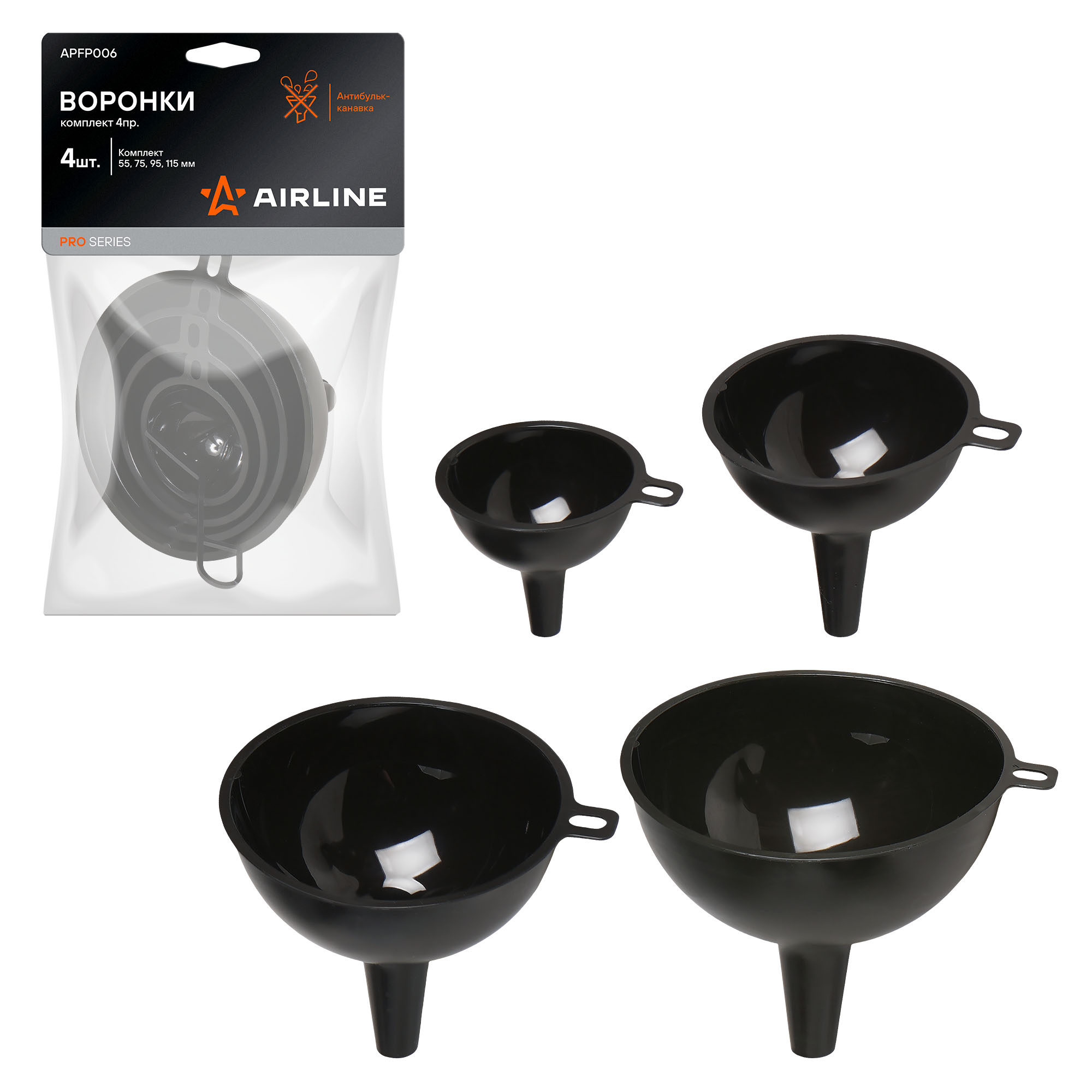Набор воронок AIRLINE APFP006 — универсальное решение для автомобилистов и специалистов, регулярно работающих с техническими жидкостями. В комплект входят четыре воронки различного диаметра: 55, 75, 95 и 115 мм, что обеспечивает удобство при работе с ёмкостями разного размера.