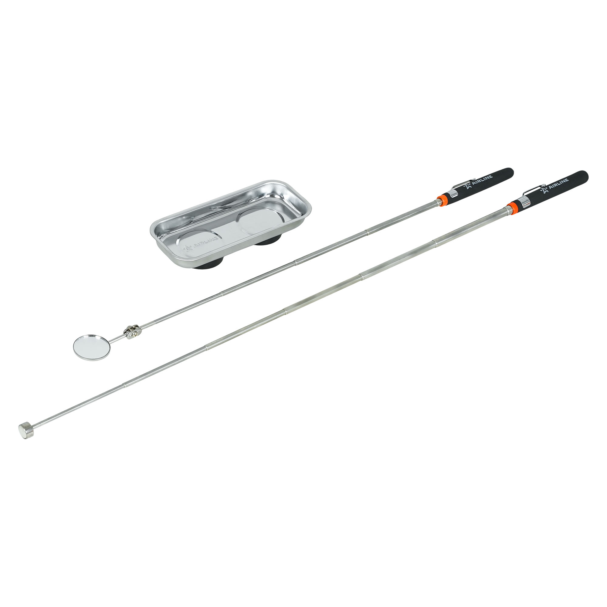 Инструмент инспекционный, набор 3пр. (захват телескоп., зеркало телескоп., магнитная тарелка), предназначен для удобной работы с мелкими металлическими деталями, такими как гайки, болты, шайбы и винты. Этот комплект станет незаменимым помощником в автомастерских, сервисных центрах и домашних условиях.