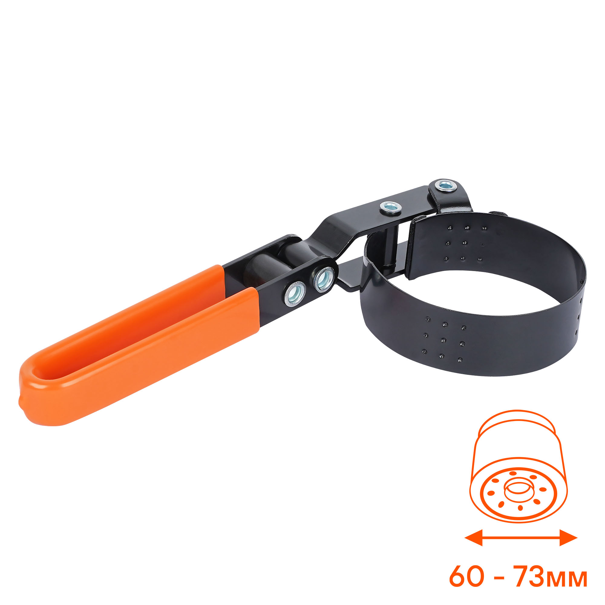 Инструмент поможет произвести демонтаж масляного фильтра автомобиля. Конструкция для съема фильтра представлена в виде металлического зажима, с помощью которого закрепляется деталь. Рабочий диапазон 60-73 мм.