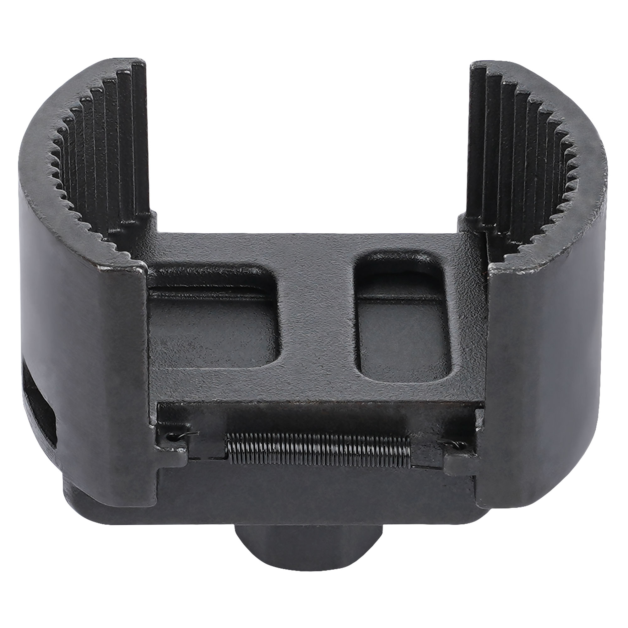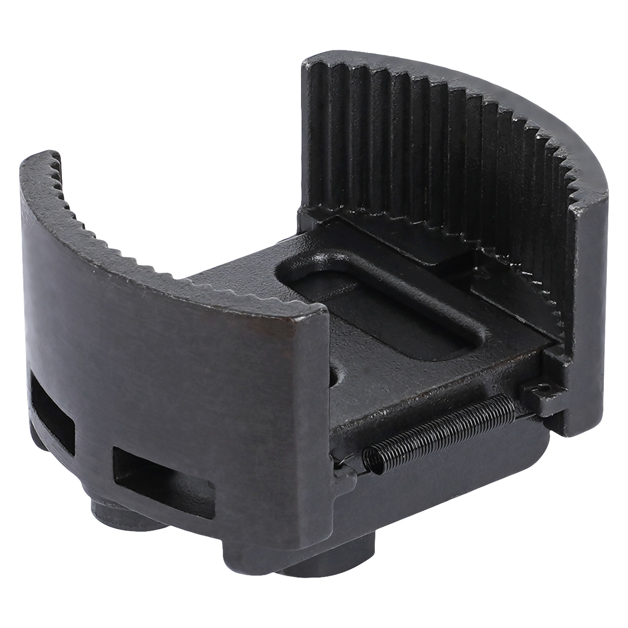 Инструмент поможет произвести демонтаж масляного фильтра автомобиля. Конструкция для съема фильтра представлена в виде полукруглых захватов , с помощью которых закрепляется деталь. Съемник изготовлен из металла. Размер зажима равен 80-105 мм.