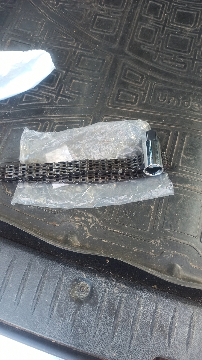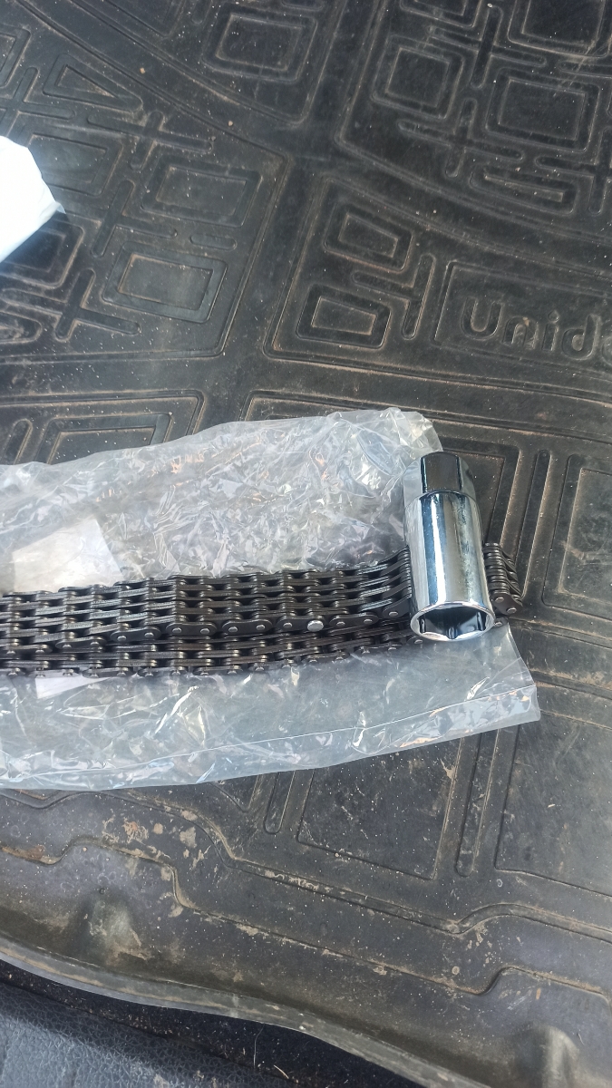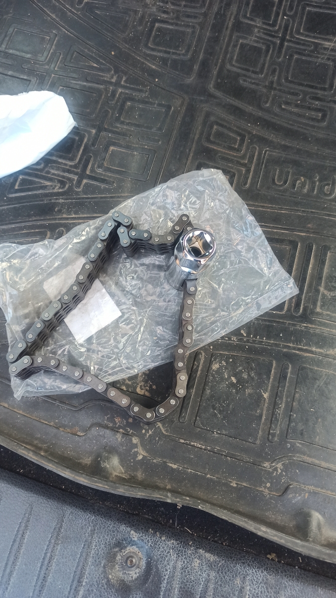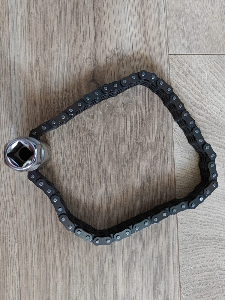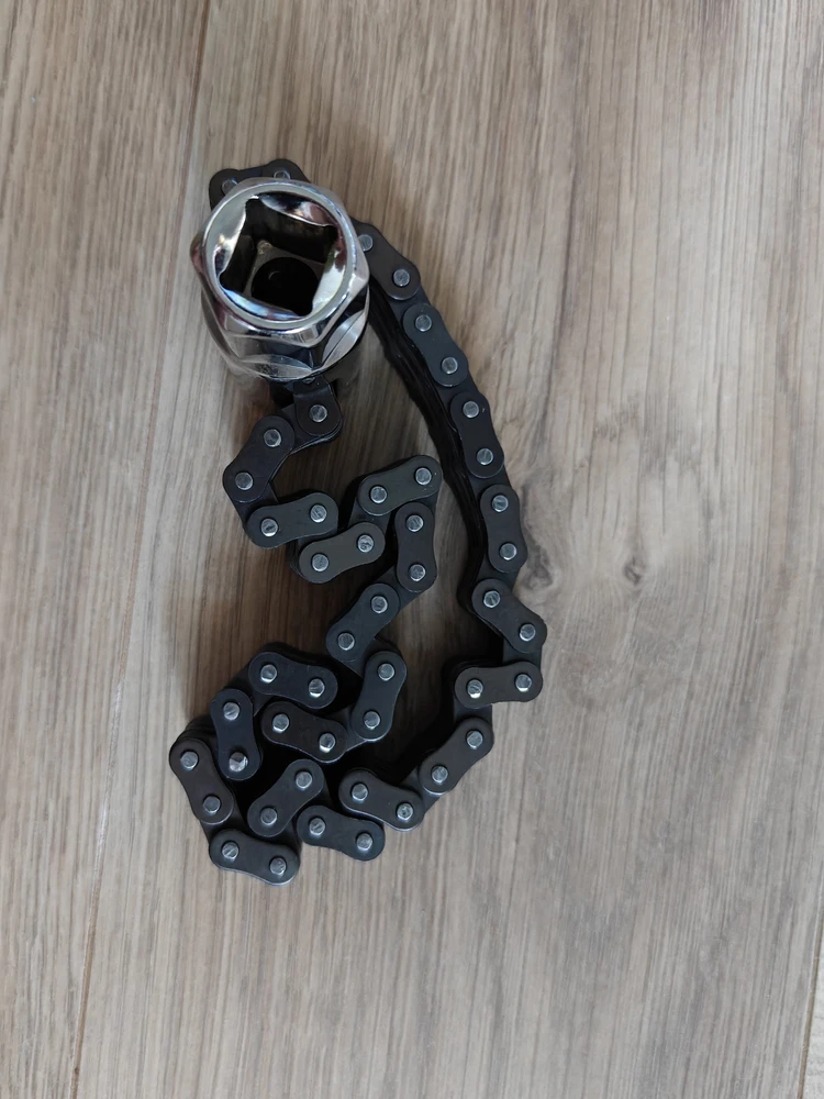 Инструмент поможет произвести демонтаж масляного фильтра автомобиля. Конструкция для съема фильтра представлена в виде головки и цепного зажима, с помощью которого закрепляется деталь. Размер зажима равен до 120 мм.
