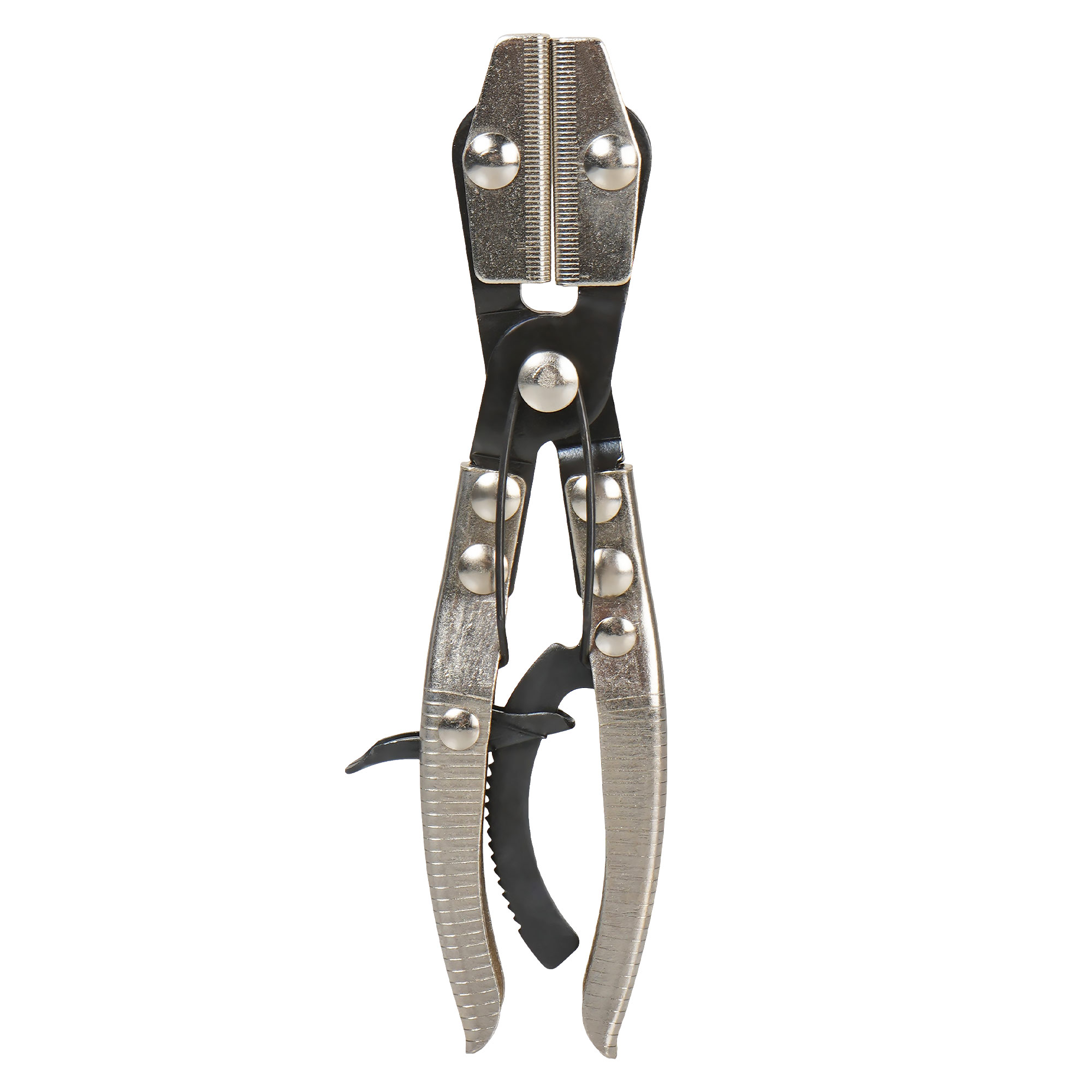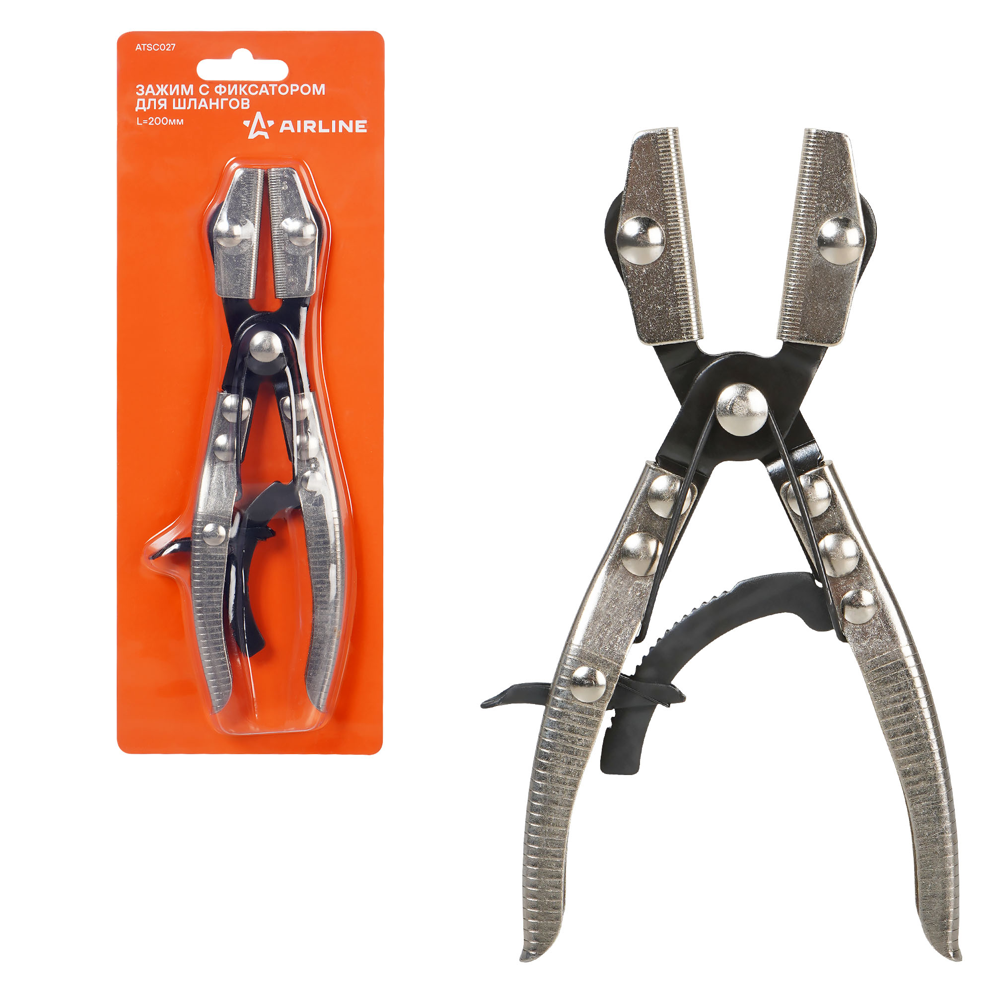 Зажим с фиксатором для шлангов L=200мм., предназначен для временного перекрытия топливных, вакуумных и охлаждающих шлангов во время технического обслуживания и ремонта. Позволяет быстро и надежно зафиксировать шланг, предотвращая утечку жидкости или воздуха.