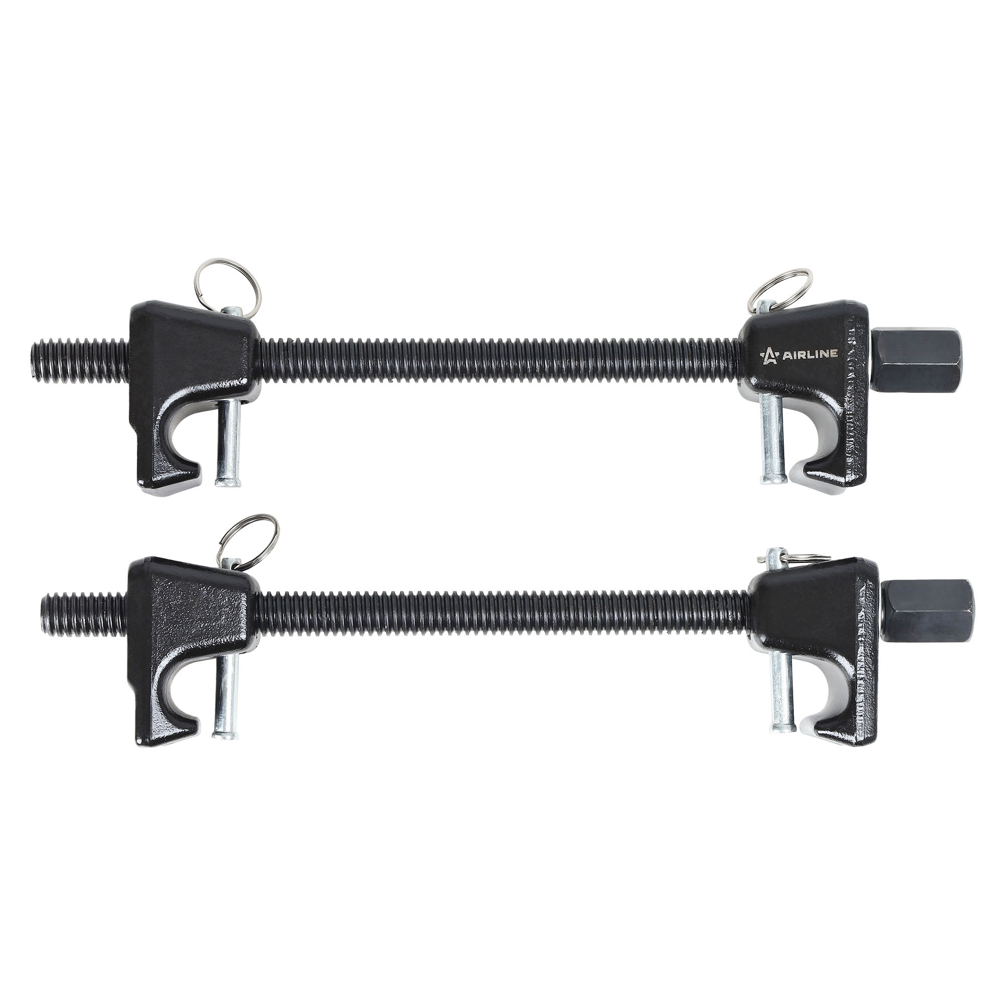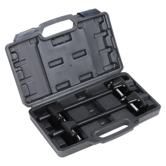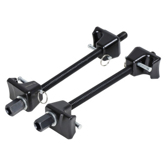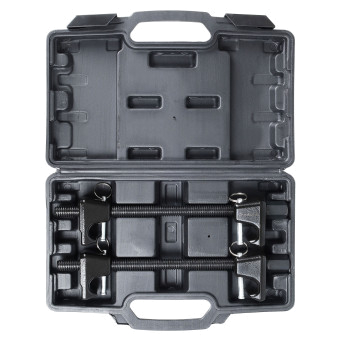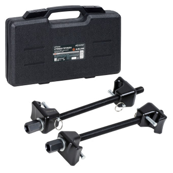 Комплект предназначен для безопасной установки и демонтажа пружин подвески автомобилей. Оснащены защитными стопорами для надежной фиксации и безопасной работы. Максимальный захват пружины составляет 270мм. Общая длина изделия - 325мм.