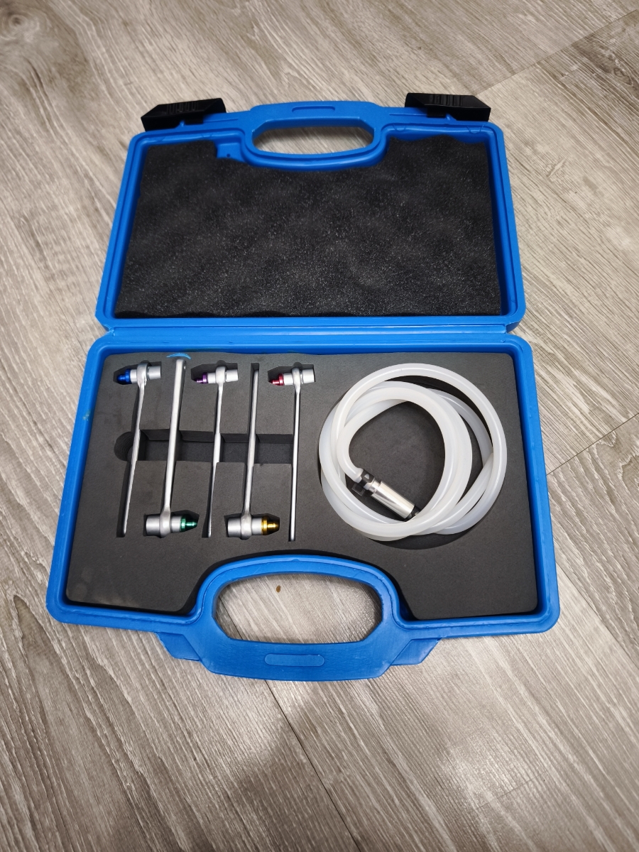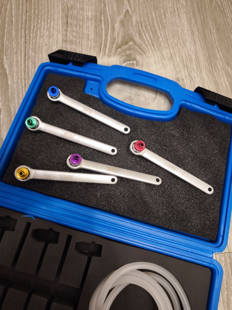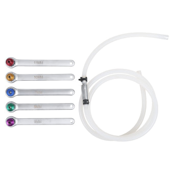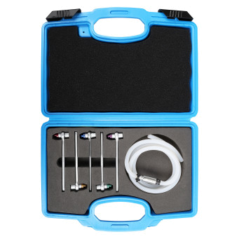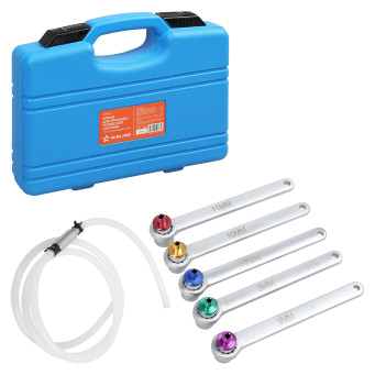 Набор предназначен для обслуживания тормозной системы и системы гидравлического сцепления без необходимости снятия колёс. Содержит 5 ключей с внутренним клапаном, предотвращающим обратный ток воздуха, и силиконовую трубку длиной 1 метр. Подходит для большинства легковых и коммерческих автомобилей.