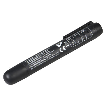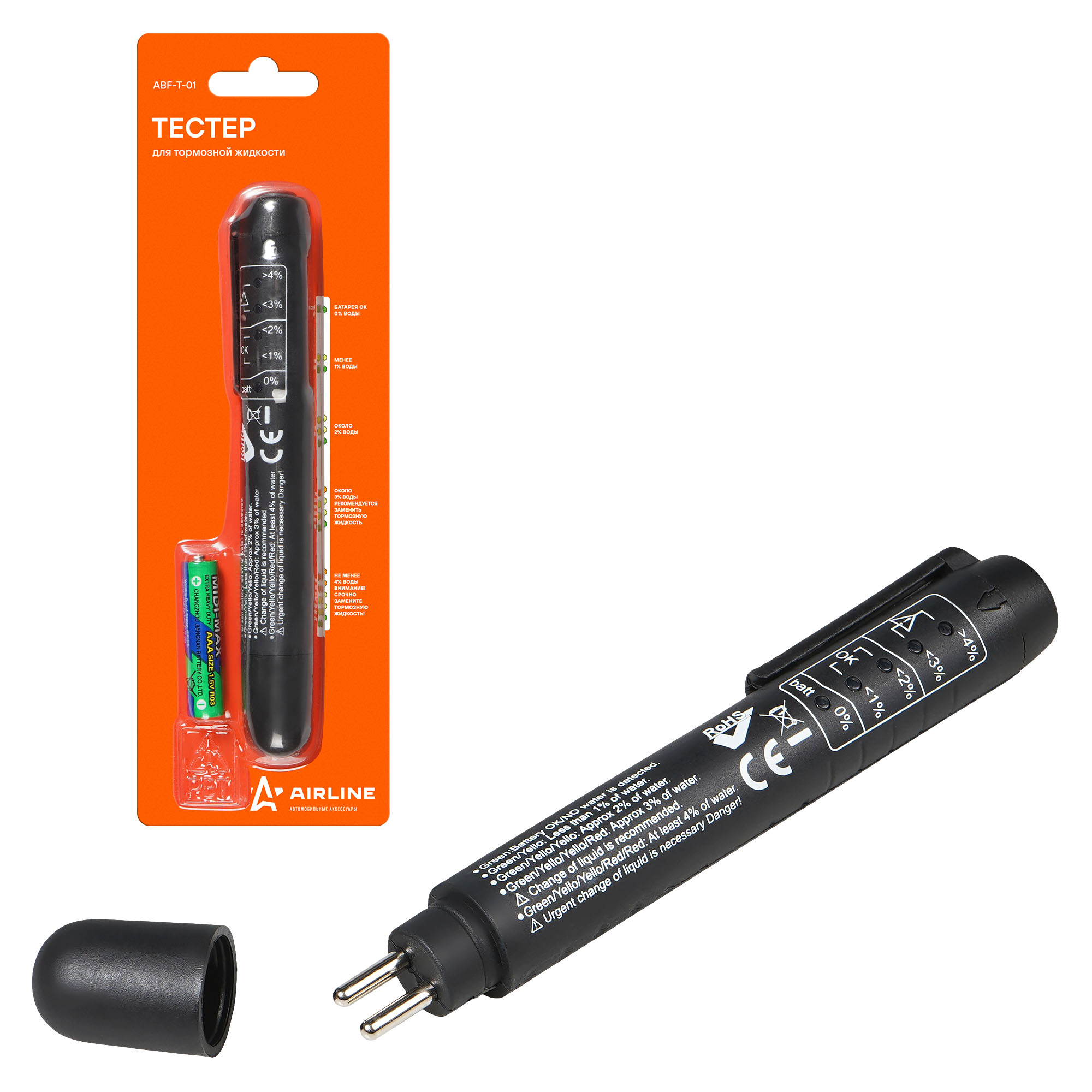 Портативный тестер позволяет определить количество влаги, растворённой в тормозной жидкости. Для тестирования нужно погрузить электроды прибора в бачок с тормозной жидкостью. Отображение результата происходит при помощи светодиодных индикаторов разного цвета, в соответствии со шкалой, нанесенной возле них.