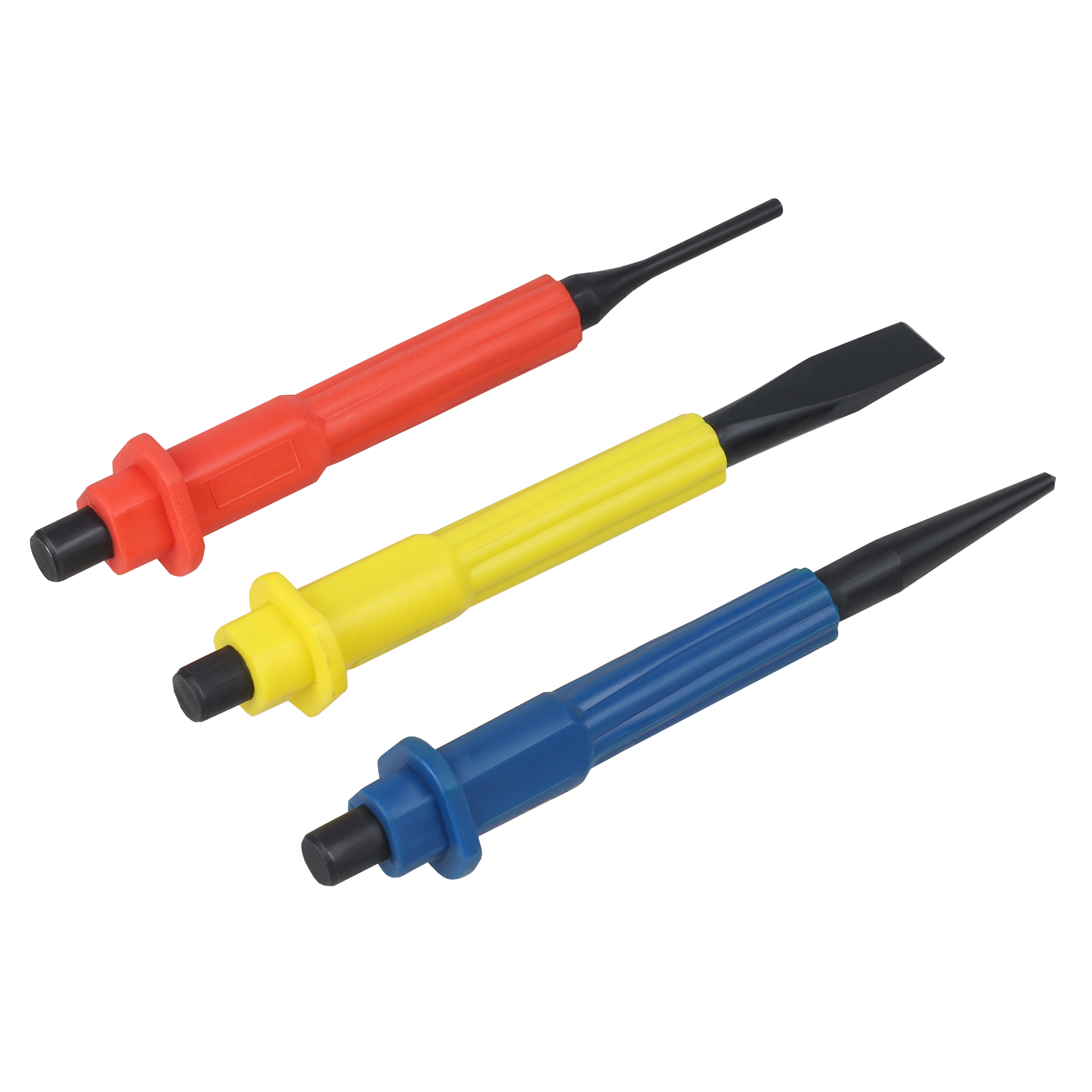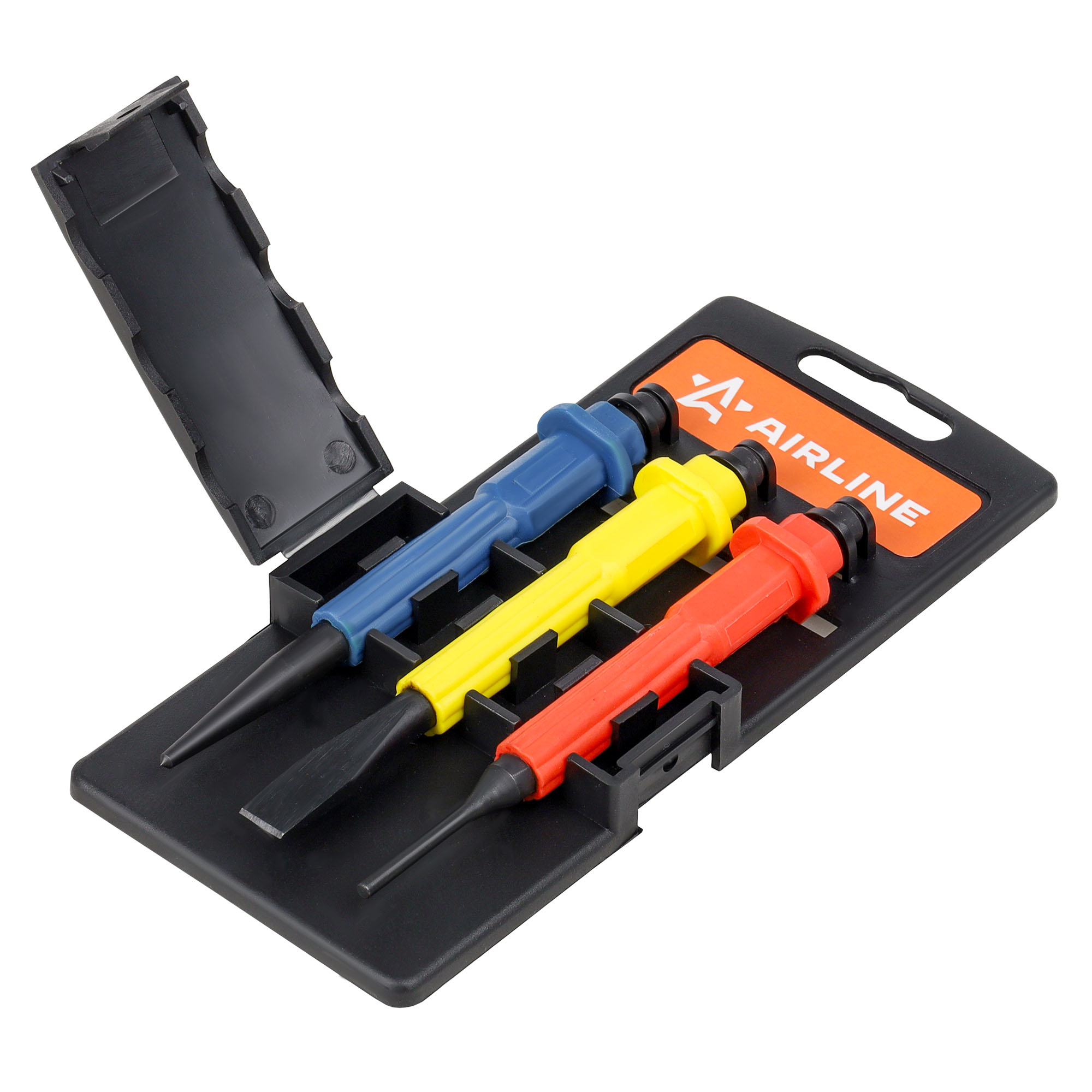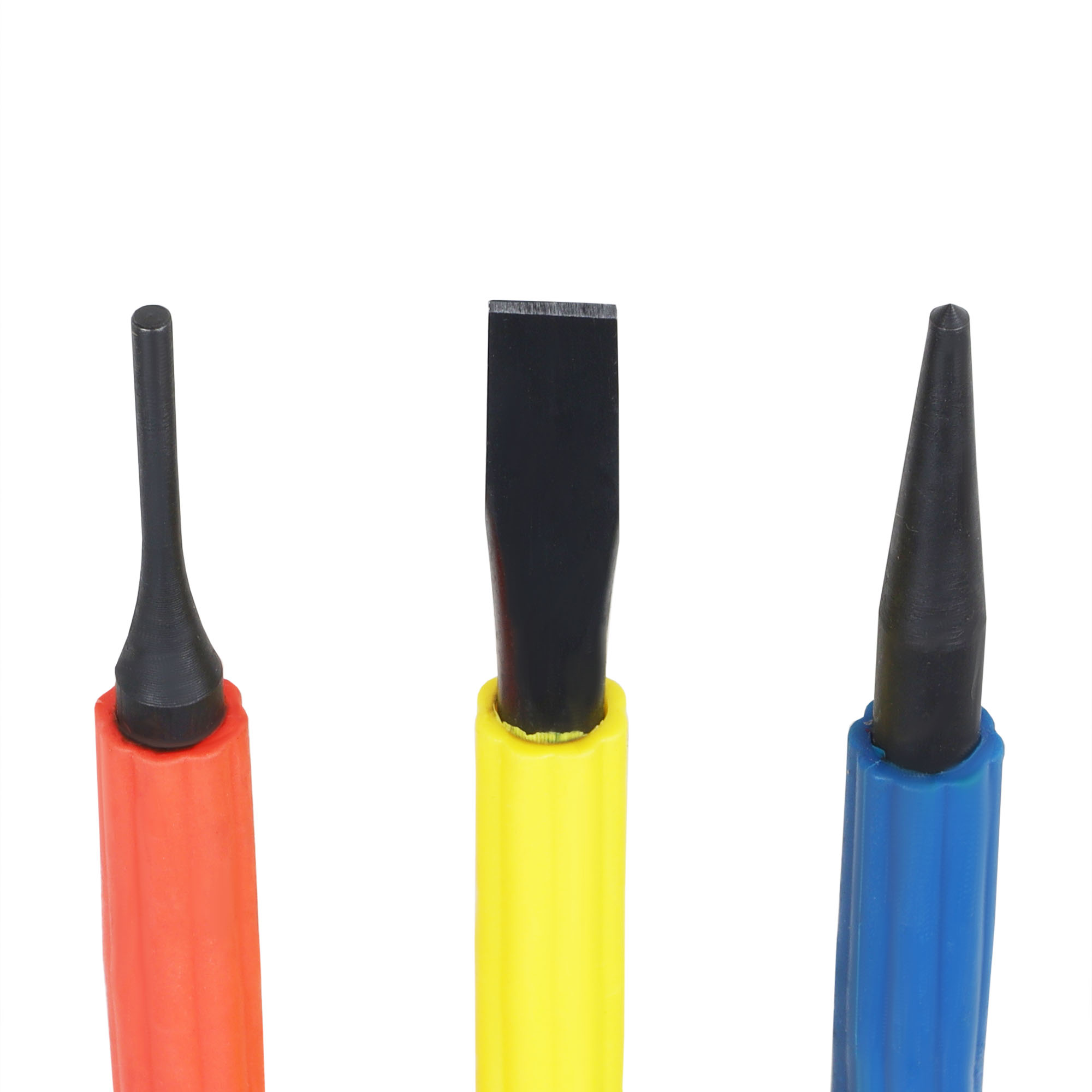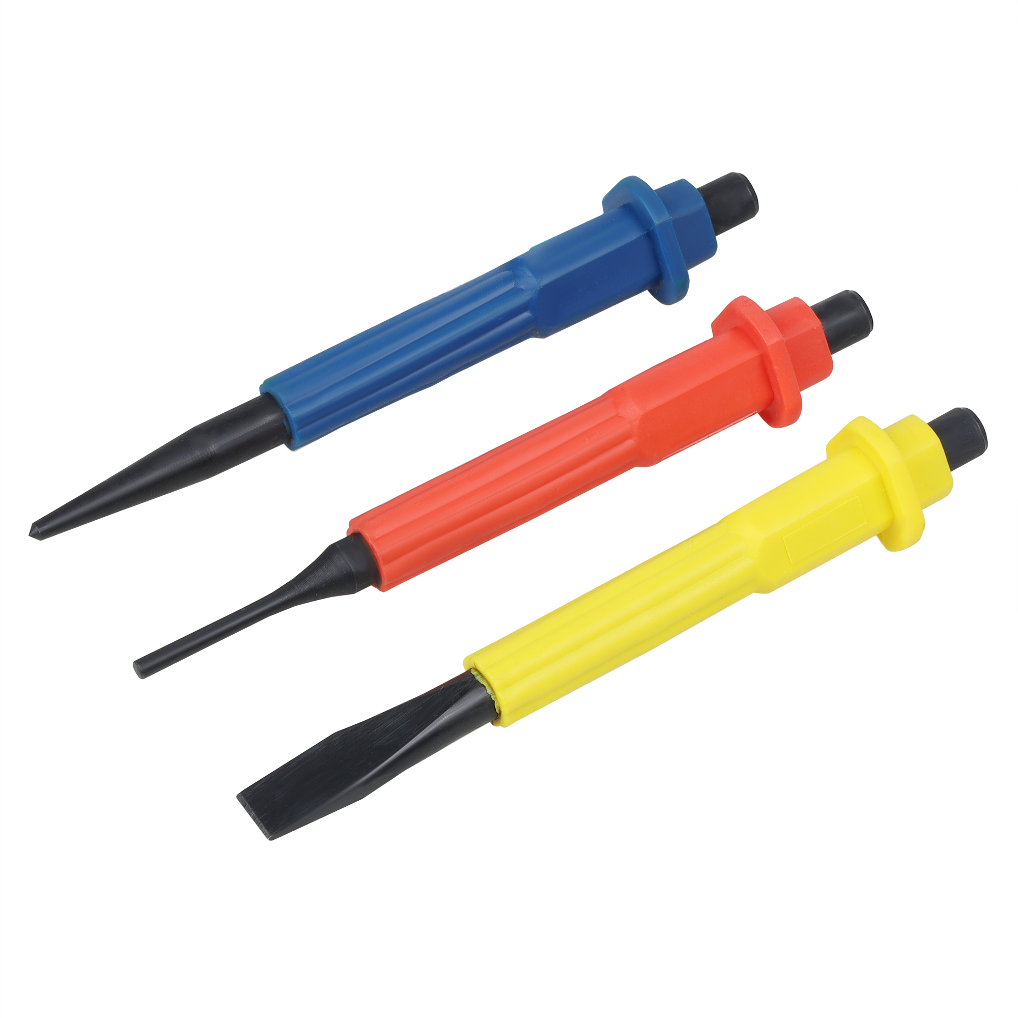 Набор 3 предмета (кернеры и зубило) предназначен для слесарно-монтажных и разметочных работ. В комплект входят два кернера для нанесения точных центровочных углублений перед сверлением и одно зубило для рубки и разделения металлических заготовок. Все элементы набора изготовлены из закалённой инструментальной стали, обладают высокой твёрдостью, износостойкостью и рассчитаны на работу с ударными нагрузками. Комплект обеспечивает точность, надёжность и долговечность при профессиональном использовании.