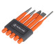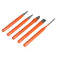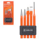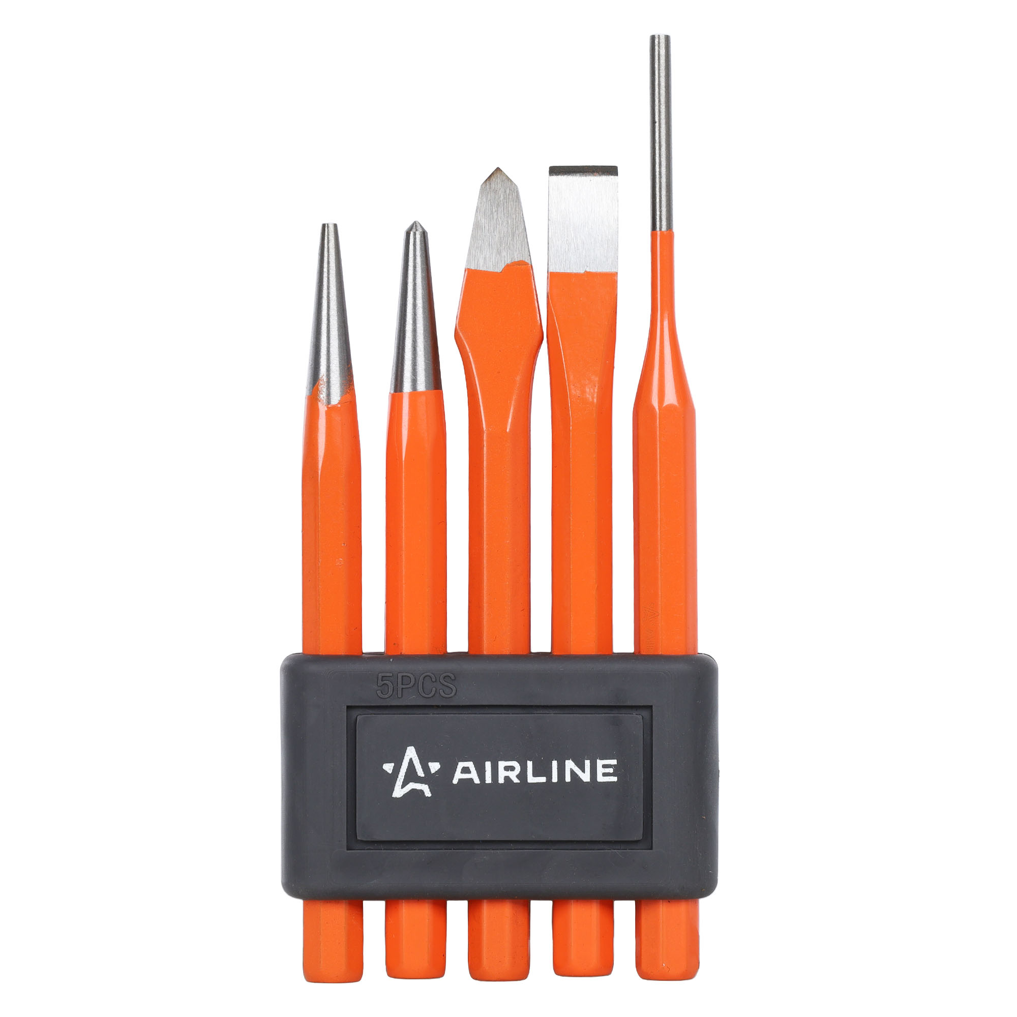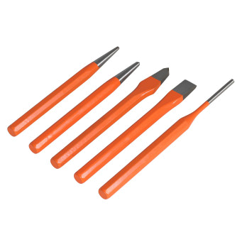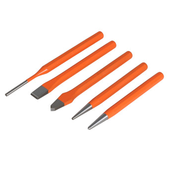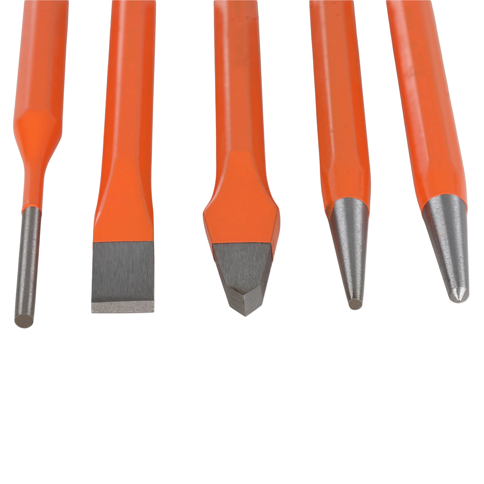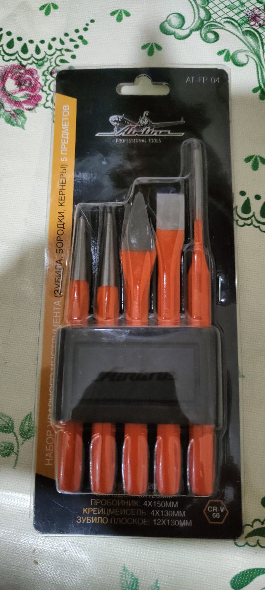 Набор (5 предметов) включает в себя ручные ударно-режущие инструменты, предназначенные для работы с металлом, камнем, бетоном и кафелем. В набор входят керны, которые используются для формирования прицельных ямок в различных материалах, таких как металл и керамика, перед последующим сверлением, а также зубила для обработки камня и бетона. Все инструменты изготовлены из прочной ударопрочной стали, стойкой к механическим нагрузкам, что обеспечивает их долговечность и надежность. Для удобства хранения и транспортировки инструменты упакованы в жесткий холдер.