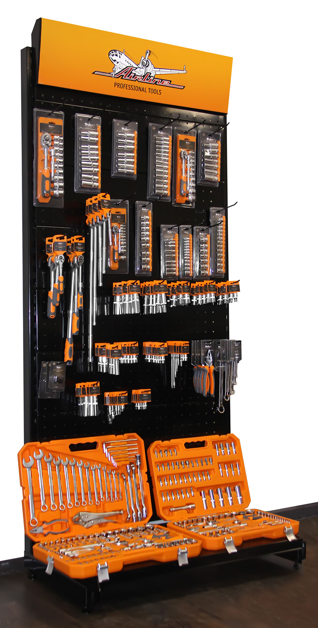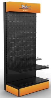 Размеры стенда 100*230 см, 40 крючков, 2 полки