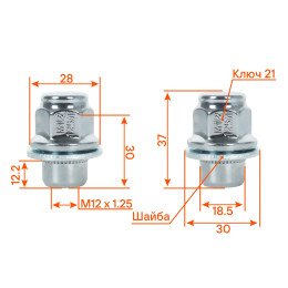 Болт колесный M12x1,25x28x57,4, конус, ключ 19, дакромет, 1 шт для Jeep/Dodge